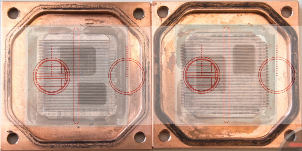 Как видно из схемы, оба движка полностью покрывают все кристаллы процессоров 3000 серии. Теперь остается разобраться в оптимальном расположении потоков относительно ядер. При правильном подключении, входящий поток поступает в отверстие, которое ближе к центру на схеме, далее на распределительную щель в центре и наконец по микроканалам движется к выходному отверстию (которое справа от центра на схеме). Но поток уходящий вправо от щели будет преодолевать меньшее расстояние до выхода, чем поток уходящий влево. Т.к. наиболее горячие 7-нм кристаллы ни при каком расположении не могут быть по центру (оптимальном положении для данного типа водоблоков), то, можно предположить, что лучше им быть справа от щели, ближе к выходному отверстию. Тут есть 2 варианта: - слева на схеме больше подойдет для 6/8 ядерников, т.к. 14-нм кристалл по центру, а единственный 7-нм кристалл справа. - справа на схеме больше подойдет для 12/16 ядерников, т.к. оба 7-нм кристалла будут справа. Вполне возможно, что если поменять местами вход и выход, то для какого-то варианта это будет даже лучше, но скорее всего все варианты будут отличаться весьма несущественно. Главное иметь ровное основание, наносить термоинтерфейс достаточно тонким слоем (возможно по рисовому зернышку над каждым кристаллом будет оптимальным вариантом) и обеспечить правильный прижим.