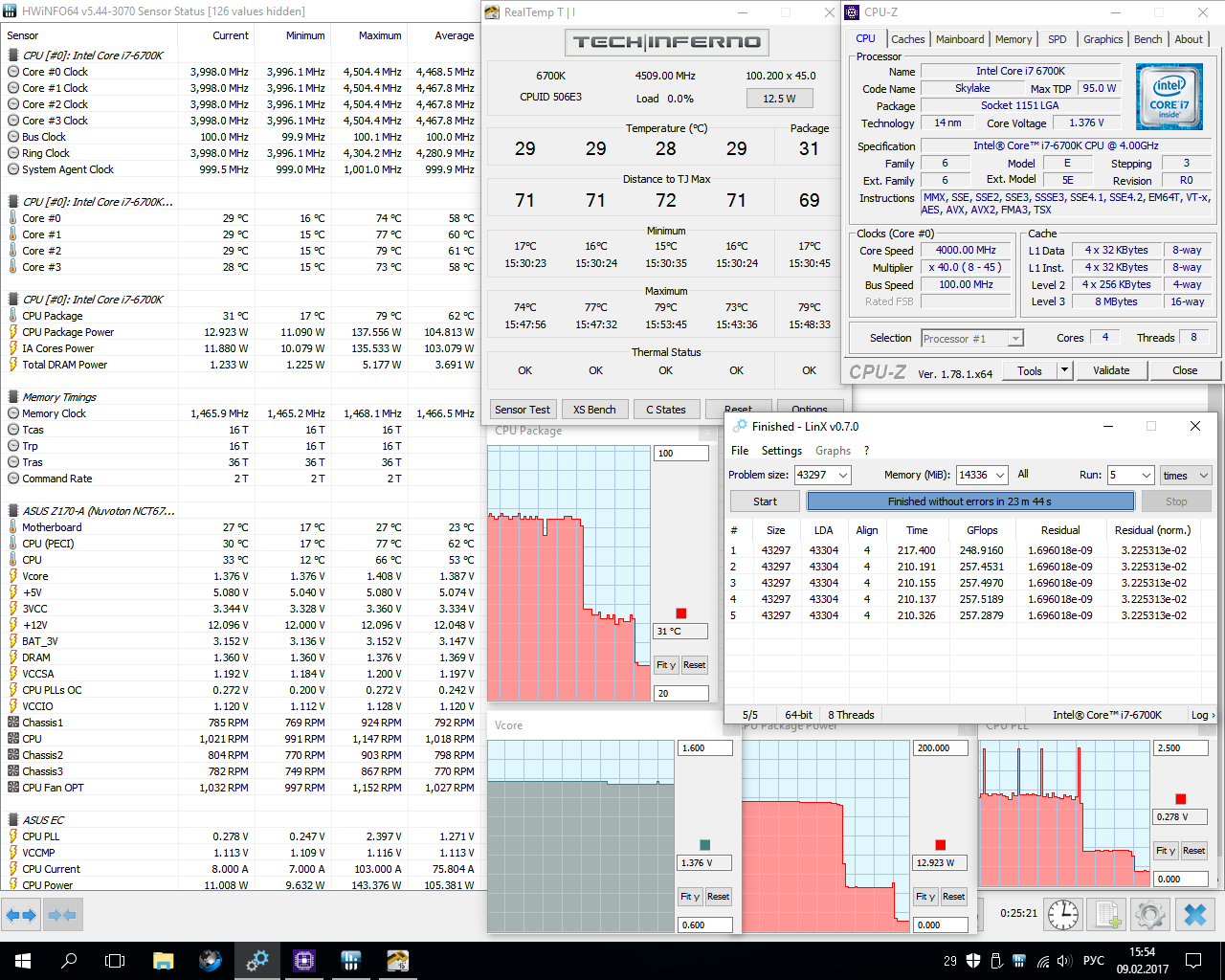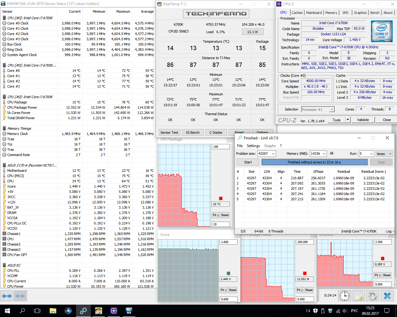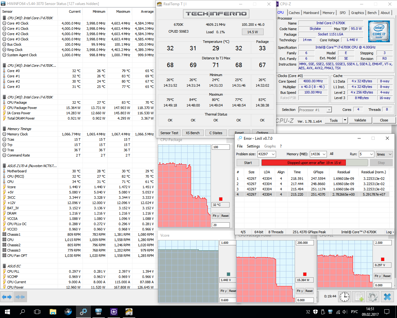 Сегодня поэкспериментировал с разгоном 6700K, используя только самый свежий LinX 0.7.0. - Cначала попробовал прогнать линпак на тех же 4600/1.456, убрав разгон памяти и соответственно vccio и vccsa на дефолт. Не только не исчезла ошибка, но и возникла раньше!