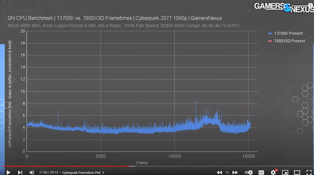 Еще важно сказать про постоянство временного кадра. Т.е чтобы не было как сейчас у амд 100фпс потом 10, 70, 30 фпс и.т.д. 2 графика, разброс у интела намного меньше чем у амд = ощущается плавнее (красные пики = просадки\статеры\фризы фпс) Низкая скорость памяти, высокие тайминги - будут тормоза.