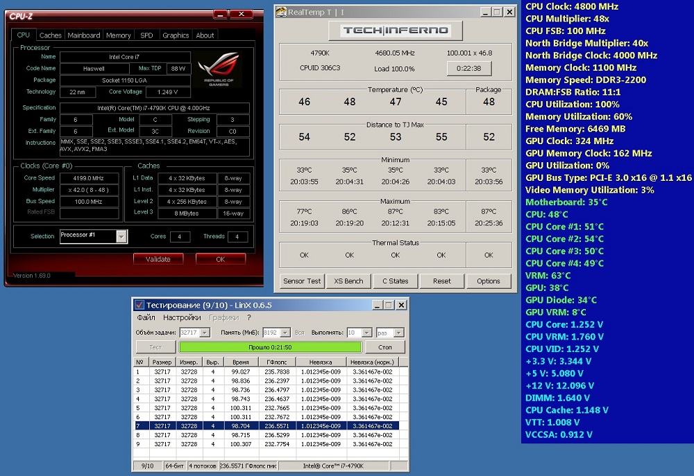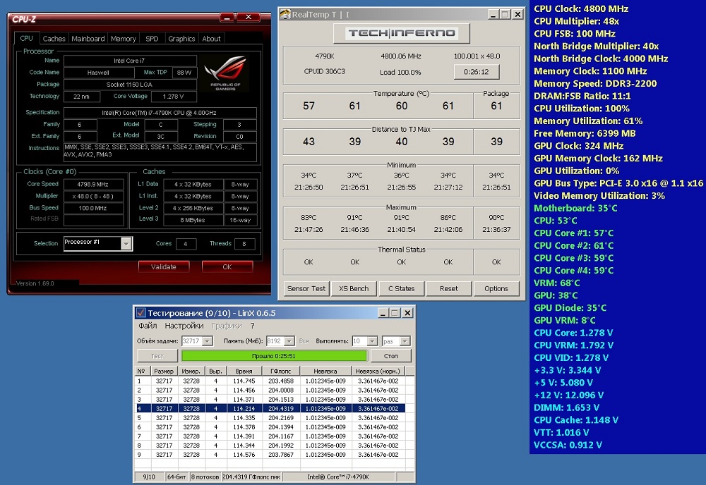 PS: температуры - высоковаты эт да, но у меня на радиаторах (3+1 секции 120) вентиляторы на 1500 работают - не шумно и в целом эффективно. Более высокие частоты - будем штурмовать позже, наверное