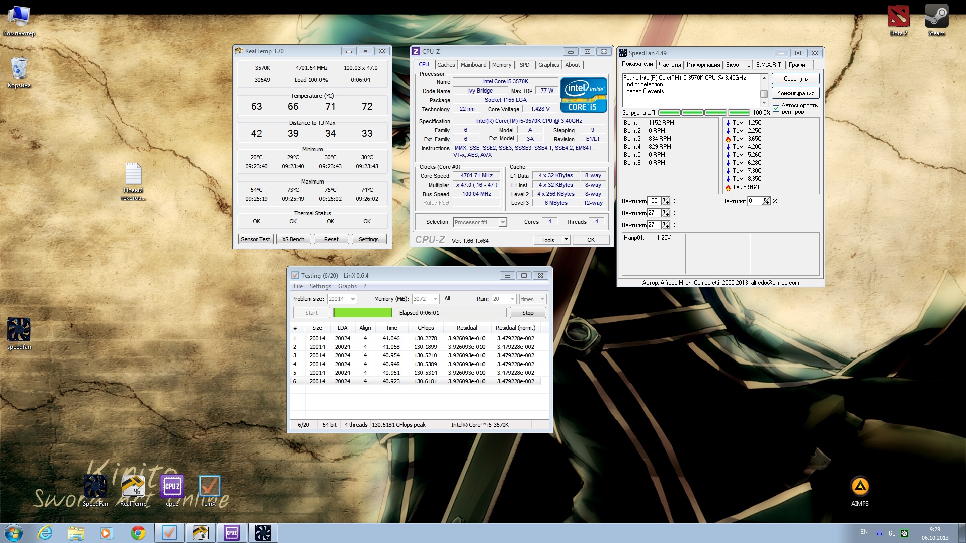 Я новенький. Как вам результаты? 4500MHz, i5-3570K, Windows 7 x64 SP1, воздух (Zalman CNPS11X Performa), Vcore 1.208v, Asus P8Z77-V LE Plus, LinX 64Bit