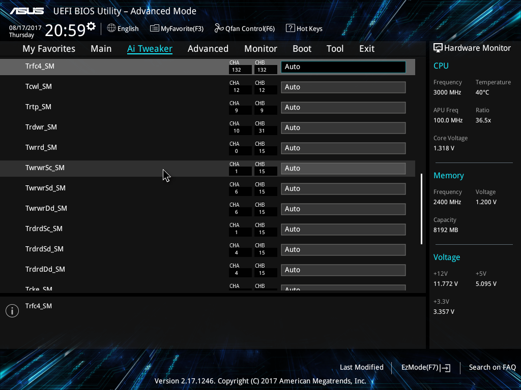 [2017/09/19 19:56:08] Частота памяти [DDR4-3333MHz] Custom CPU Core Ratio [Авто] > CPU Core Ratio [39.25] EPU Power Saving Mode [Отключено] OC Tuner [Keep Current Settings] Performance Bias [Авто] Напряжение VDDCR CPU [Offset mode] Знак режима смещения VDDCR CPU [+] VDDCR CPU Offset Voltage [0.22500] VDDCR SOC Voltage [Авто] Напряжение DRAM [1.37500] Напряжение 1.05V SB [Auto] Напряжение 2.5V SB [Auto] Напряжение CPU 1.80В [Auto] VTTDDR Voltage [0.73750] VPP_MEM Voltage [2.55000] Калибровка CPU Load Line [Экстремальный] VDDCR SOC Load Line Calibration [Экстремальный] VDDCR CPU Power Phase Control [Экстремальный] VDDCR CPU Switching Frequency [300] Target TDP [Auto] DRAM CAS# Latency [16] Trcdrd [19] Trcdwr [19] DRAM RAS# PRE Time [19] DRAM RAS# ACT Time [38] Trc_SM [58] TrrdS_SM [6] TrrdL_SM [9] Tfaw_SM [25] TwtrS_SM [5] TwtrL_SM [13] Twr_SM [20] Trcpage_SM [Auto] TrdrdScl_SM [5] TwrwrScl_SM [5] Trfc_SM [Auto] Trfc2_SM [Auto] Trfc4_SM [Auto] Tcwl_SM [14] Trtp_SM [12] Trdwr_SM [Auto] Twrrd_SM [Auto] TwrwrSc_SM [Auto] TwrwrSd_SM [Auto] TwrwrDd_SM [Auto] TrdrdSc_SM [Auto] TrdrdSd_SM [Auto] TrdrdDd_SM [Auto] Tcke_SM [5] ProcODT_SM [60 ohm] Cmd2T [1T] Gear Down Mode [Disabled] Power Down Enable [Авто] RttNom [Rtt_Nom Disable] RttWr [Dynamic ODT Off] RttPark [RZQ/4] Security Device Support [Enable] SHA-1 PCR Bank [Enabled] SHA256 PCR Bank [Enabled] SHA384 PCR Bank [Disabled] SHA512 PCR Bank [Disabled] Pending operation [None] Platform Hierarchy [Enabled] Storage Hierarchy [Enabled] Endorsement Hierarchy [Enabled] TPM2.0 UEFI Spec Version [TCG_2] Physical Presence Spec Version [1.2] TPM Device Selection [Discrete TPM] Erase fTPM NV for factory reset [Enabled] PSS Support [Enabled] NX Mode [Enabled] SVM Mode [Enabled] SMT Mode [Авто] Core Leveling Mode [Automatic mode] SATA Port Enable [Включено] PT Aggresive SATA Device Sleep Port 0 [Отключено] PT Aggresive SATA Device Sleep Port 1 [Отключено] PT XHCI GEN1 [Авто] PT XHCI GEN2 [Авто] PT USB Equalization4 [Авто] PT USB Redriver [Авто] PT PCIE PORT 0 [Авто] PT PCIE PORT 1 [Авто] PT PCIE PORT 2 [Авто] PT PCIE PORT 3 [Авто] PT PCIE PORT 4 [Авто] PT PCIE PORT 5 [Авто] PT PCIE PORT 6 [Авто] PT PCIE PORT 7 [Авто] Onboard PCIE LAN PXE ROM [Включено] AMD CRB EHCI Debug port switch [Отключено] IGFX Multi-Monitor [Отключено] Primary Video Device [PCIE / PCI Video] Hyper kit Mode [Отключено] SATA Port Enable [Включено] SATA Mode [AHCI] Проверка состояния S.M.A.R.T [Enabled] Hot Plug [Отключено] Hot Plug [Отключено] Hot Plug [Отключено] Hot Plug [Отключено] Hot Plug [Отключено] Hot Plug [Отключено] Соответствие ErP [Отключено] Возобновление подачи питания [Откл.] Включение посредством PCI-E [Отключено] Включение посредством Ring [Отключено] Включение посредством RTC [Отключено] Контроллер звука высокой четкости [Включено] Тип передней панели [HD Audio] Тип выхода SPDIF [SPDIF] LED Lighting [Breathing Mode] Fan RGB [Включено] Контроллер Asmedia USB 3.1 [Включено] Realtek LAN Controller [Enabled] Realtek PXE OPROM [Disabled] Зарядка устройств USB в режиме S5 [Включено] Последовательный порт 1 [Enabled] Change Settings [IO=3F8h; IRQ=4] Сетевой стек [Отключено] Debug Port Table [Disabled] Debug Port Table 2 [Disabled] Поддержка устаревших интерфейсов USB [Enabled] XHCI Hand-off [Enabled] JetFlashTranscend 8GB 1.00 [Auto] USB Device Enable [Enabled] USB3_1 [Включено] USB3_2 [Включено] USB3_3 [Включено] USB3_4 [Включено] USB3_5 [Включено] USB3_6 [Включено] USB3 [Включено] USB4 [Включено] USB5 [Включено] USB6 [Включено] Температура процессора [Monitor] Температура материнской платы [Monitor] Скорость процессорного вентилятора [Monitor] Скорость корпусного вентилятора [Monitor] Напряжение процессорного ядра [Monitor] Напряжение 3.3 В [Monitor] Напряжение 5 В [Monitor] Напряжение 12 В [Monitor] Управление процессорным вентилятором [PWM Mode] CPU Fan Speed Lower Limit [200 RPM] Профиль процессорного вентилятора [Стандарт] Управление скоростью корпусного вентилятора [DC Mode] Chassis Fan Q-Fan Source [CPU] Минимальная скорость корпусного вентилятора [600 RPM] Профиль корпусного вентилятора [Стандарт] Быстрая загрузка [Enabled] Следующая загрузка после сбоя питания [Нормальная загрузка] Включение логотипа при загрузке [Авто] Время задержки POST [3 sec] Состояние NumLock при загрузке [Вкл.] Ожидание 'F1' при ошибке [Включено] Сообщения Option ROM [Force BIOS] Перехват 19-прерывания [Отключено] Режим настройки [EZ Mode] Запуск CSM [Включено] Параметры загрузочных устройств [UEFI и Legacy OPROM] Загрузка с сетевых устройств [Legacy only] Загрузка с устройств хранения [Legacy only] 