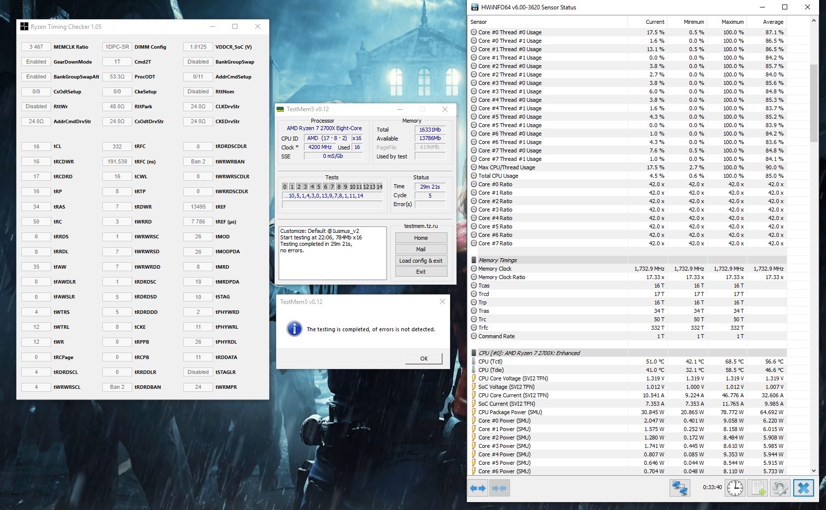 короче, отчаялся выправить 3466 на новом биосе, и откатил на 3400 с настройками на низкий RDS/RDL и tRFC442. ТМ5 прошел за 19мин 03с, что как бы быстрее, чем 3466 на тех же настройках (19м 50с). Линкс 33к х10 прошел, прайм 2ч вроде держится, дальше уже комп нужен был. В линксе результат на полгигафлопса меньше, чем на 3466 на тех же вторичках (потеря аж 0,27%, катастрофа просто). В Realbench результаты близко к 3466, в винраре и 7zip даже чуть выше. В ларке результат на уровне погрешности. Пару игр погонял, фризов нет. Посижу-ка я пока так. Как-то пользы от 66мгц решительно никакой. Да, отрицательный оффсет был исключен из списка подозреваемых, поэтому оставил -0,1v, так предельная темпа на 2 градуса ниже. RAM 1.360v, soc 0.9750, LLC авто. Калькулятор по таймингам для оем ничего нового не предлагает, те же CL17 и RCDWR=RCDRD, чего память категорически не приемлет. Продолжаем сидеть на самосборе.