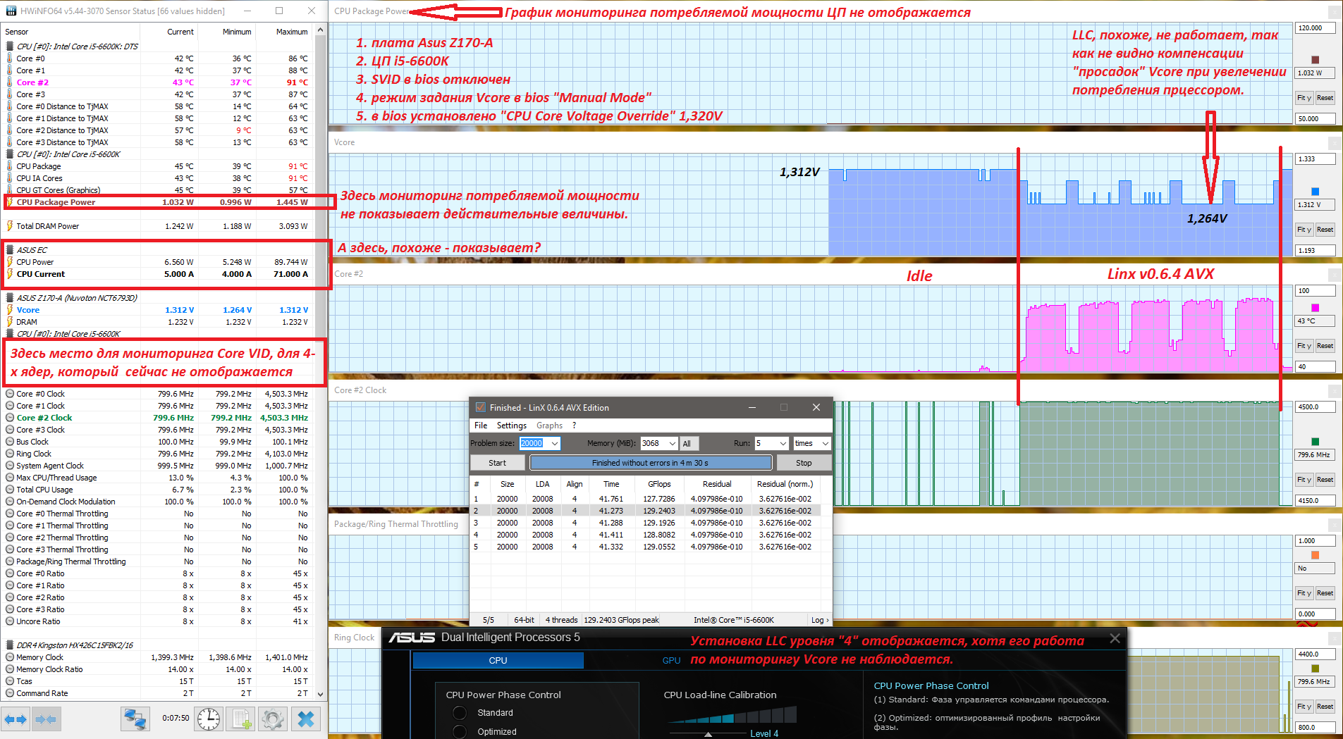 Опыт показывает, что формирование напряжения Vcore происходит при отсутствии сигналов VID, соответственно мониторинг не отображает и "Core VID" ядер - вообще! Попутно замечены следующие любопытные эффекты: - перестало адекватно отображаться значение мощности ЦП "CPU Package Power" - это та мощность, которую мониторинг "берёт" с ЦП (на моей картиночке заголовок этого раздела не показан, в HWiNFO он называется [CPU[#0]: Intel Core i5-6600K]) ; - сохраняется отображение мощности потребления ЦП и тока потребления ЦП в разделе мониторинга, который берётся с т. н. "Asus Embedded Controller" - Asus (EC), показания выглядят адекватно по размерам величин; - похоже, что не работает включённый LLC, так как Vcore успешно "проваливается" под нагрузкой. ------------------------------------------------------------------------ О мониторинге мощности потребления ЦП На отображении мощности потребления ЦП хотелось бы остановиться поподробнее, так как это, имхо, важнейшая "интегральная" характеристика, влияющая как уровень нагрузки на VRM платы, так и на нагрев ЦП. 1. В различных опытах не раз замечал, что в HWiNFO отображение мощности "CPU Package Power" ("от процессора"), и мощности "CPU Power" ("от Asus EC"), обычно отличаются, причём второе значение немного больше первого.