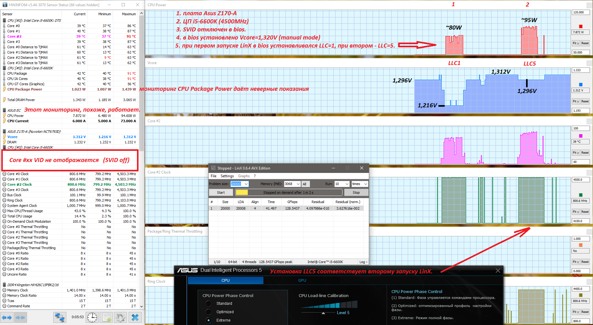 2. LLC в режиме с отключёнными Core VID всё же работает (+), но, пожалуй, не совсем так, как в режимах offset mode, adaptive mode: чтобы компенсировать значительное падение Vcore под нагрузкой, оказалось, что требуется уровень LLC не ниже 5 (на данной плате, с данным ЦП, множителем и т.п.), а в опытах в "обычных" режимах (offset, adaptive) было вполне достаточно LLC4.