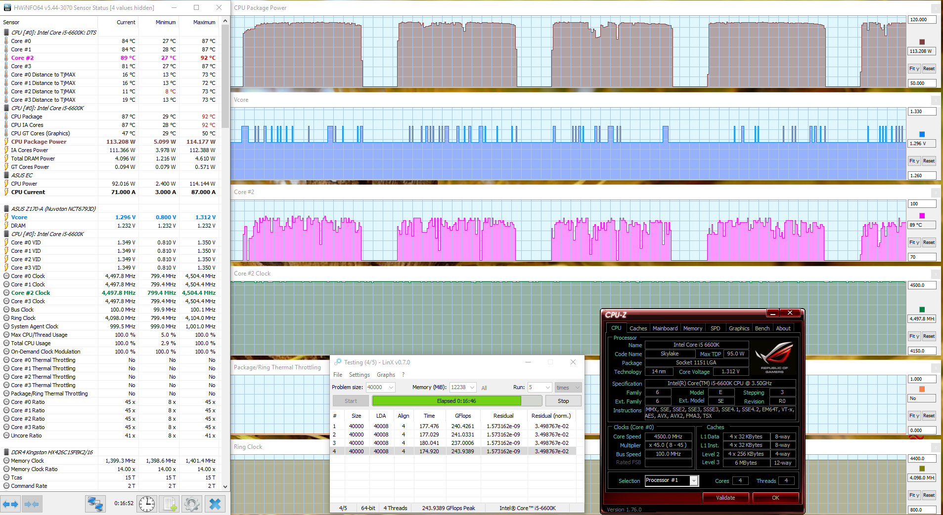 TarLink такой же процессор как у меня только разогнанный до 4.4 работает примерно на таких же напряжениях как мой в стоке , это разве нормально ? Это ведь разные экземпляры ЦП - тот, что по ссылке, и ваш, так? Разные экземпляры ЦП могут быть не похожи по ряду своих свойств: по способности работать на повышенной частоте при той или иной величине Vcore, по потребляемой в этом режиме мощности (т. е. по тому параметру, что является источником "градусов"). Мат. платы и сделанные юзером настройки тоже могут немало отличаться. Кстати, тот проц. что по ссылке (я его довольно хорошо знаю ), имеет так наз. "базовый" Vcore (Vcore VID), т. е. то напряжение Vcore, что отображается в bios при дефолтных "авто" настройках, на частоте 3500МГц - 1,168V; Интересно, какое Vcore показывается в bios для вашего экземпляра - считается, что чем это напряжение меньше, тем более способен к разгону данный экземпяр. Для информации приложу скриншот всё того же проца, с чуть большей частотой, под той же версией LinX, что у вас. Этот проц. ещё не скальпирован, работает на воздухе, его потенциал, думаю, ещё не раскрыт...