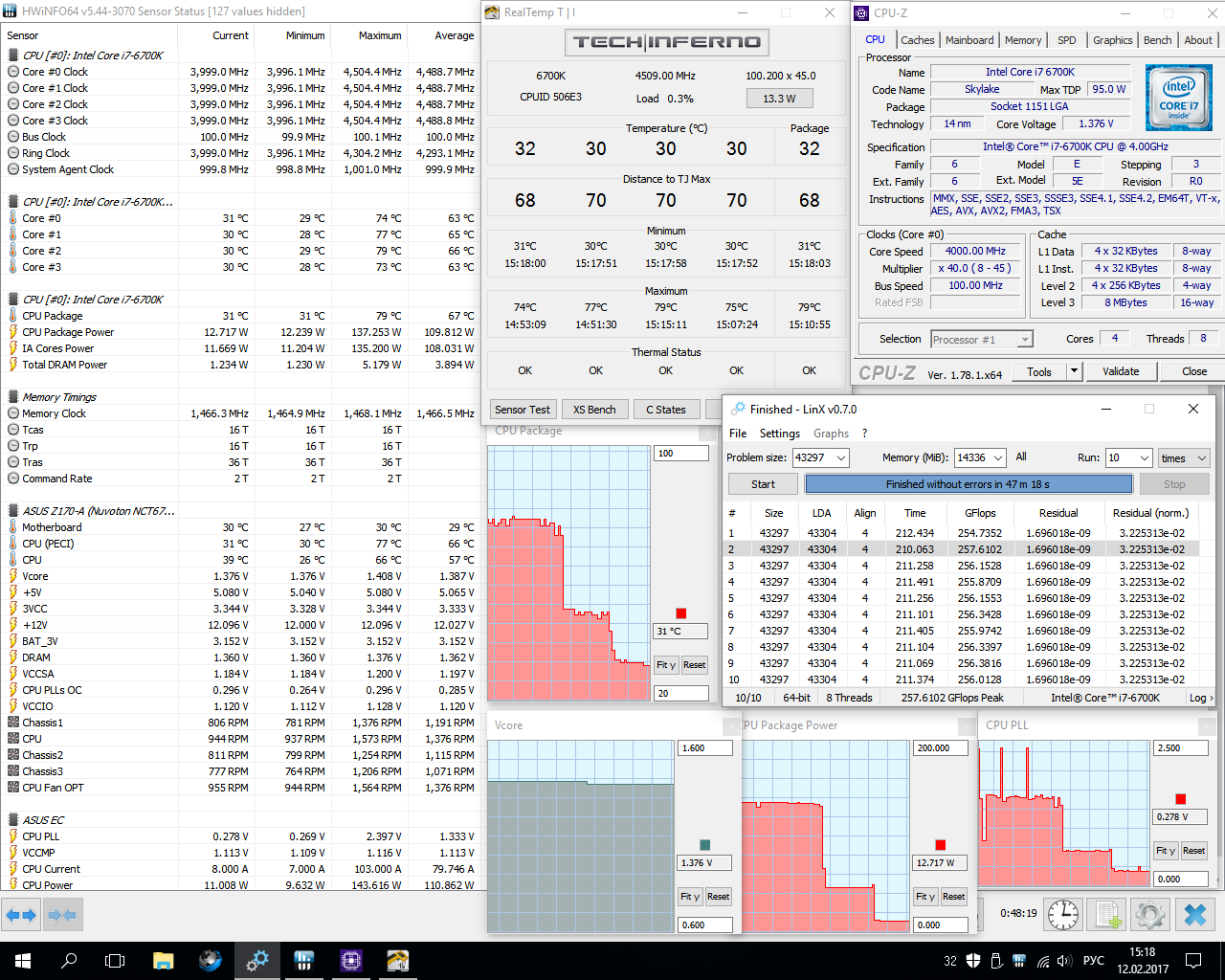 Andy119, сначала всё стояло в авто, но гнал сильно выше 95 Вт - частота не сбрасывалась. На всякий случай поставил все эти 140% и 255 А, ничего не изменилось. Опять волнуюсь из-за PLL: вчера пробовал ставить весь контроль фаз в Extreme - то же самое, на 4500/1.408 через пару минут нагрузки на CPU PLL начинаются частые пики до 2.4 В. Даже на 4600/1.456 их было меньше, а тут почти каждые 10 секунд. Пробовал даже ставить Internal PLL Voltage руками на минимальные 0.9 В. Никаких изменений - PLL в простое ~0.28, в обычной нагрузке ~1.2, в линпаке ~1.6 с этими пиками до 2.397. Может, у всех так на этих мамках, а я беспокоюсь? А какая температура безопасна в линпаке, если гонять его именно что долго? Ниже 70 или можно до 80?
