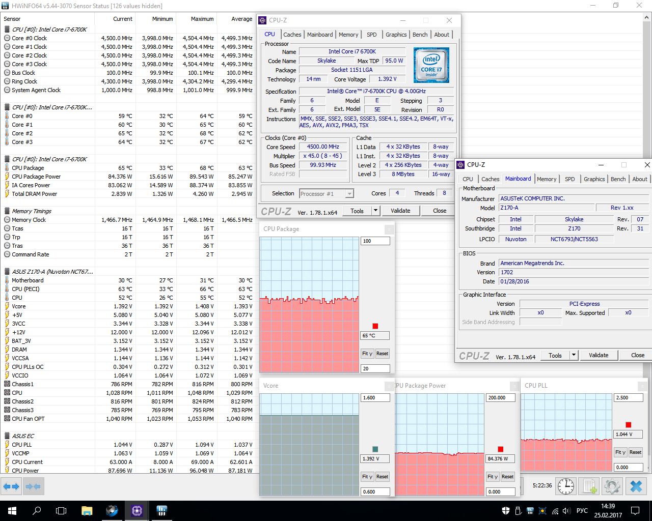 Меня уваж. Waad просил показать тот параметр, что напрягает в его мониторинге, на такой же плате - я и показал. Собственно, глянул бегло datasheet на Skylake, и вместо CPU PLL и Core PLL вижу там вообще другое: "Processor PPLs power rail" (VccPLL)... Слепо доверять, конечно, ничему нельзя - вот на одной из картинок ниже мониторинг кажет CPU PLL практич. равным нулю, это же вряд ли может быть "на самом деле"? 2 Waad Ниже картинки прогона тестов RealBench 2.44 (с сайта Asus ROG), профиль в bios поставил с бОльшим Vcore.