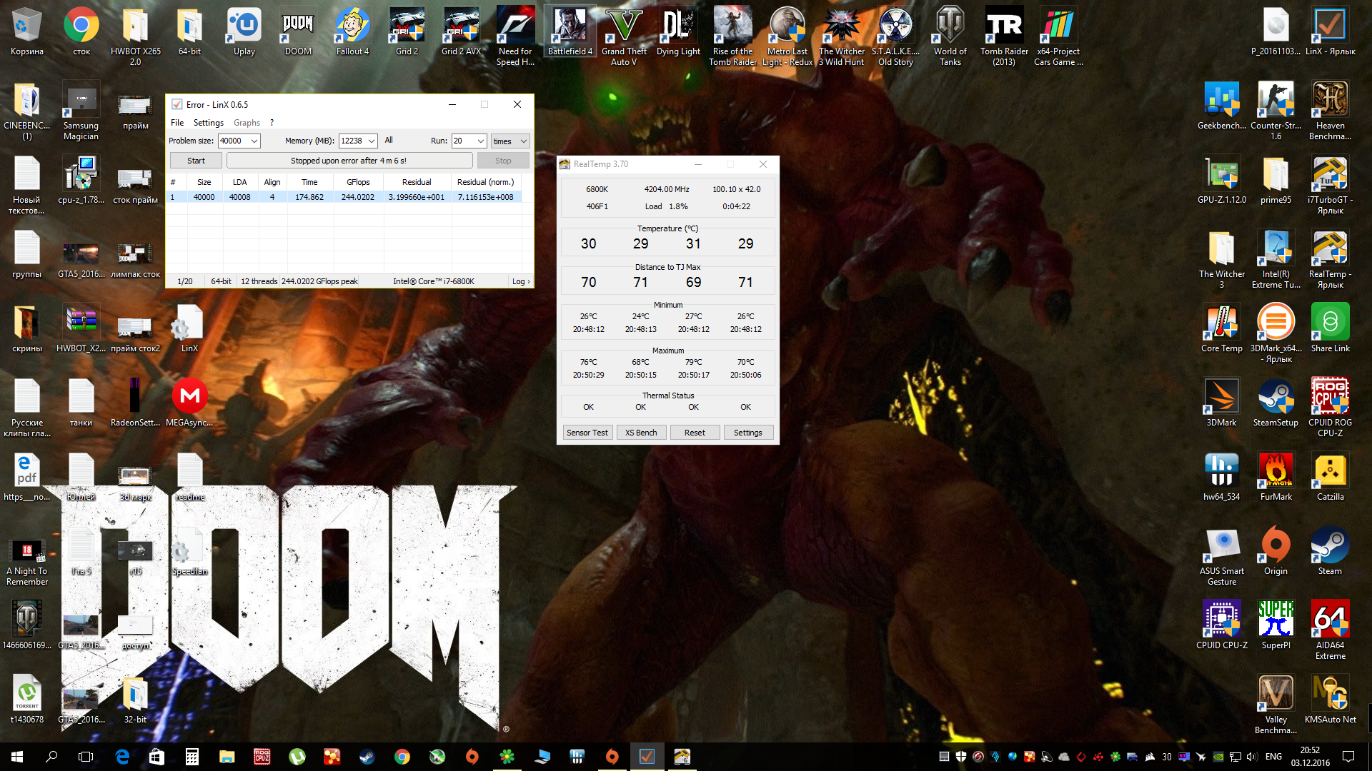 Ничего подобного. Скрин CPU-Z, мониторинг температур CoreTemp с адекватным отображением ВСЕХ ЯДЕР, ну и Linx с объемом задачи 40000. В разгоне естественно и посмотрим какие там не более 11гр и припой кривой.