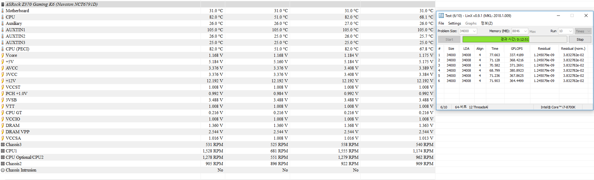 Полученный результат должен иметь следующий вид: Скриншот рабочего стола после прохождения >9 циклов (т.е. между 9 и 10 проходами). Вместе с LinX на рабочем столе должны быть развернуты CPU-Z (первая вкладка) и Core Temp, это обязательный минимум. Такой набор программ даст информацию о напряжении и температурах под нагрузкой-простоем. По желанию можете добавить другие программы, показывающие дополнительную информацию о вашей системе, например третью вкладку CPU-Z, которая покажет модель материнской платы и версию BIOS. Пример результата разгона: Mad Max, 5100 МГц (AVX 0), i7-8086K, HT-ON, Cache 4700, Vcore=1.36V, Batch L805E123, Gigabyte Z370 Aorus Gaming 7 (bios F6), Be Quiet! Dark Rock Pro 4, ЖМ под HS, Windows 10 Pro 64-bit 1809, LinX 0.9.3 64bit.