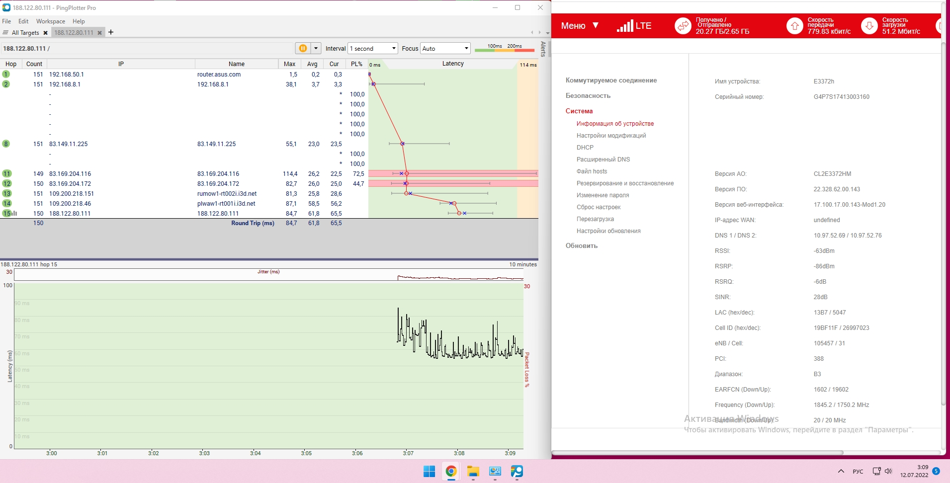 ты ещё пути погляди(pingplotter' ом например), а то может они все по одному пути ходят до твоей конечной соотв и разницы не будет. + сравни их со своим загородным LTE и этим же LTE в городе . + по сотовому, желательно отследить RSRQ,SINR,SINR,SINR, ну и диапазон LTE( B3(FDD 1800) например) там и там, по типу картинки↓, где кстати поменялись пути(уменьшилось количество hop'ов(было раза в 2 больше) в обозначенном интервале↓), ну и пинг поменьше↓ стал(варшавский сервер кваки кстати).