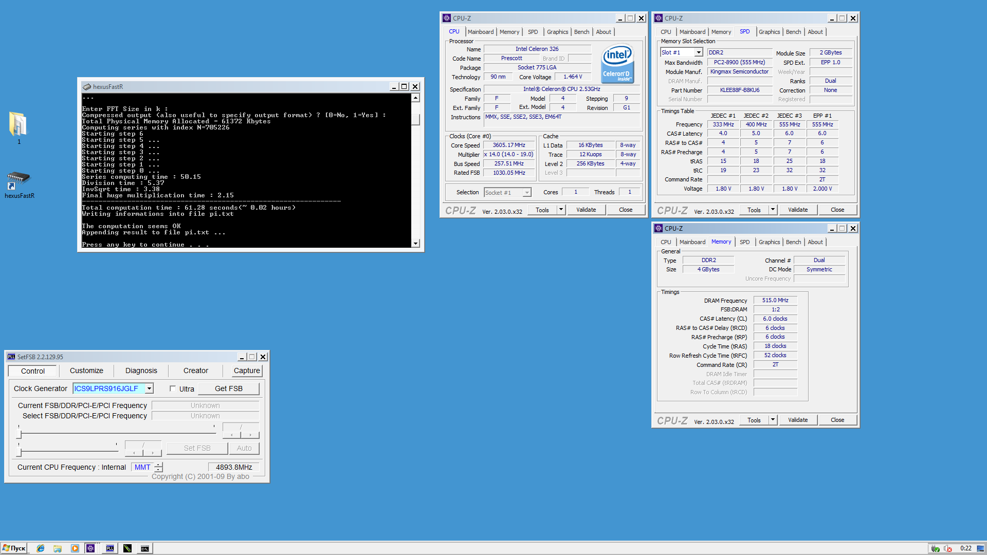 Добавлено спустя 10 минут 32 секунды: И еще одно наблюдение. Я никогда даже не втыкал шину больше 257.3, а тут с одним моулем решил глянуть когда оно поломается.... так вот, на следующем шаге прироста в пифаст не было почти, и еще два шага не было, а где-то буквально на частоте 3620 прирост уже ого-го какой... 0.2-0.3 секунды. Надо попинать Bar-Edit... но тяжело пинать когда не понимаешь нифига.