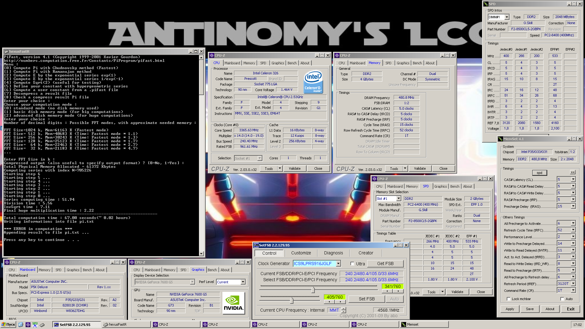 Тут вопрос в том, что именно в условиях данного соревнования уже чипсет/плата наверное решать начинает, но у уважаемого alexmaj467 имеется частота 515, тайминг 1Т и дуалчанел. Так что для меня слишком много неизвестных. Списать всё на то что дфи так хороша? А как быть с результатом? У меня итоговый выше. Но учитывая что тест выполняется порой на 0.3 секунды быстрее если просто нажать alt+enter, интерпретировать настройки непосредственно в результат - разговоры в пользу бедных. В Stage2 я наигрался... хочу сейчас подтвердить по информации от alexmaj467 что у меня в MCHBAR и так отражались оптимальные настройки, выкусить перемычку (или выключатель туда впаять?) и начать улучшать результат в Stage1. Память я теперь умею запускать чуть быстрее благодаря советам alexmaj467 и TerraRaptor.