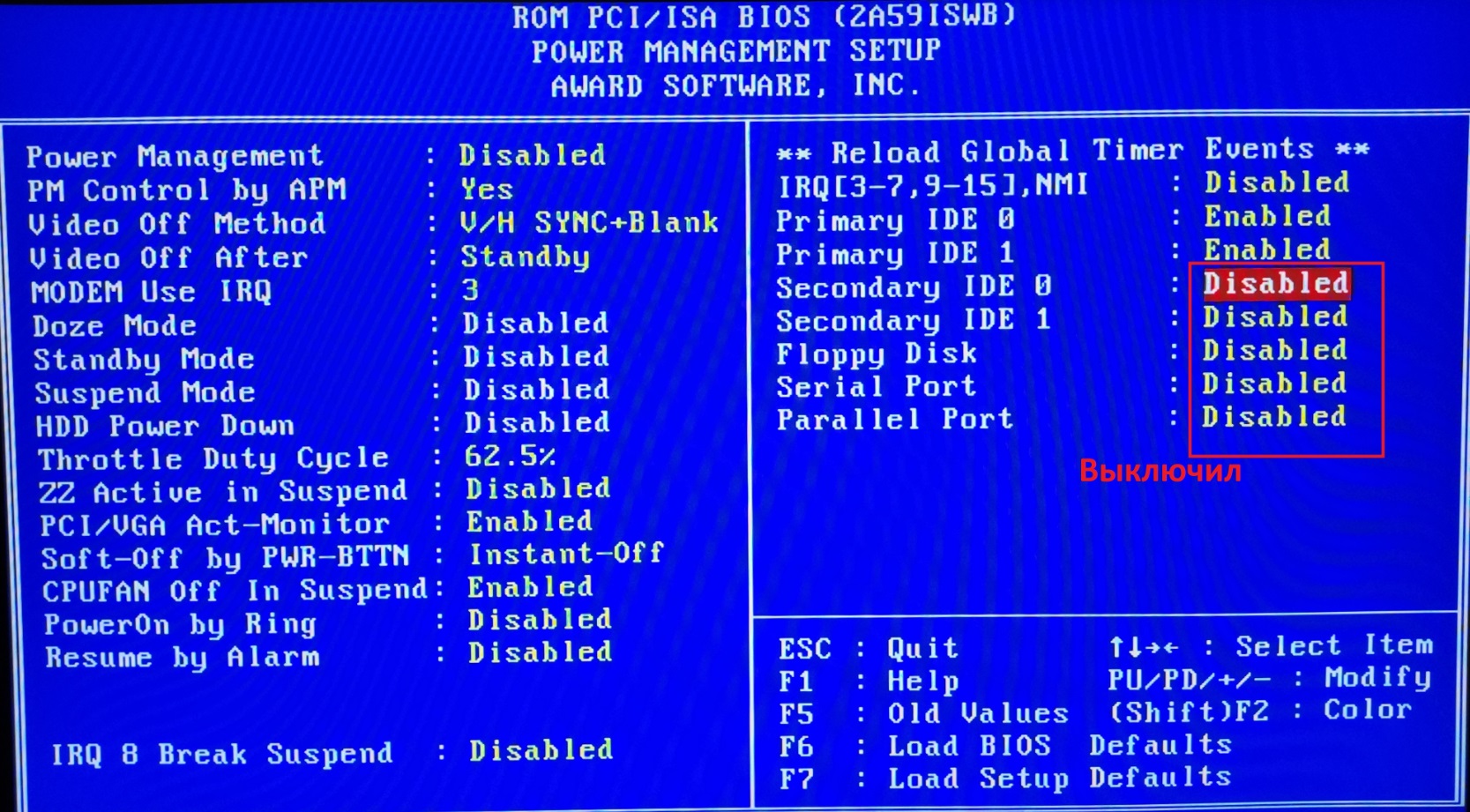 Обратите внимание на надпись о недостатке ресурсов. В этот момент из PCI устройств в системе только 2 видеокарты. ISA слоты тоже пустые. Никаких дополнительных внешних контроллеров не подключено. Попробовал отключить остальные ненужные устройства: