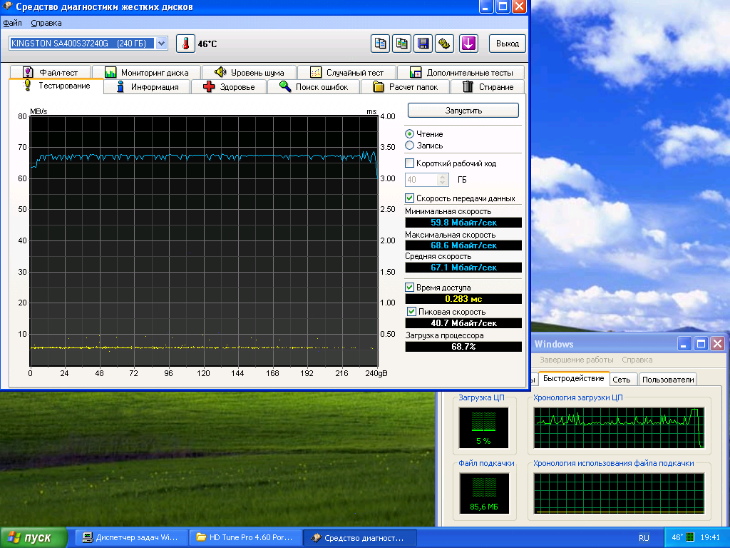 С IDE винтом всё понятно, он упирается в 33MB/s предела шины IDE на моей матери. А вот от SSD ожидал большего. Первое ограничение это Sata1 (150MB/s), это понятно. Второе ограничение это лимит самой шины PCI в 133MB/s. Ожидал увидеть значения 100-110 Mb/s, по факту 60-68MB/s. Но если посмотреть на загрузку ЦП, видно что при тесте HDD загрузка ~10%, а при тесте SSD загрузка уже под 70%. Возможно узкое горлышко снова ЦП... Короче если кто-то, как я, планировал гигабитную сетёвку на Pentium mmx, можно смело ограничиться моделью на 100Mbit/s. Видимо гигабитная сетёвка начнёт раскрываться минимум от Pentium II и выше...