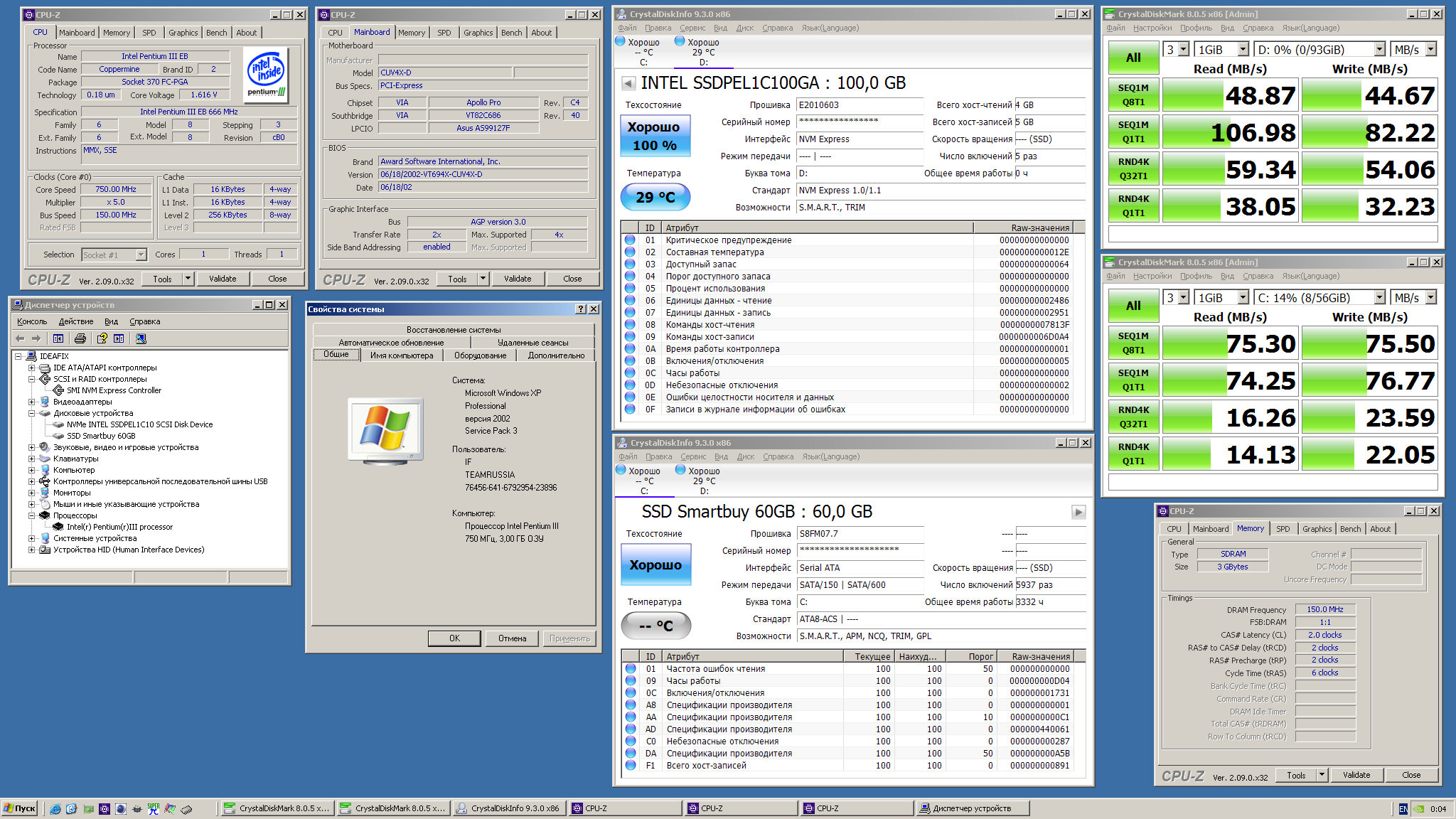 Работает вторым диском NVME накопитель в XP сносно. Картинка - просто иллюстрация, не итоговый тест, работы Optane DC 4801 на pentium 3 667 Второй SSD - Смартбай Игнишен МЛЦ на 60ГБ на южном мосту (вия 686б и переходник с иде на сата)