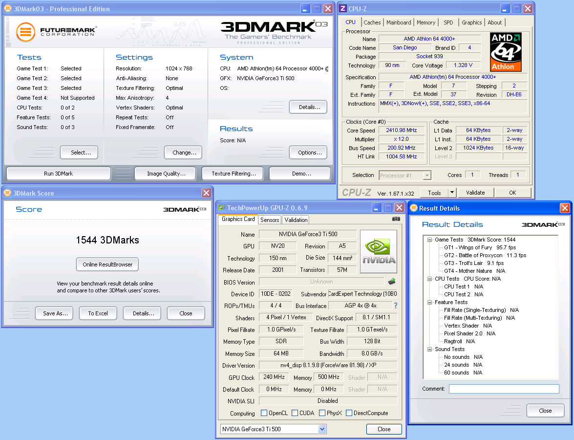 Не пойму почему, но в 4 случаях из 5 на 3 тесте 3DMark03 система зависала с артефактами на экране. То есть 1 и 2 тесты нормально проходят, а в третьем (trolls lair) - сначала идет нормально, затем в один момент - артефакты в клеточку и зависание. Отвал чипа чтоли... либо 64 метров памяти не хватает... пробовал 45.23 и 81.98 - разницы нет.