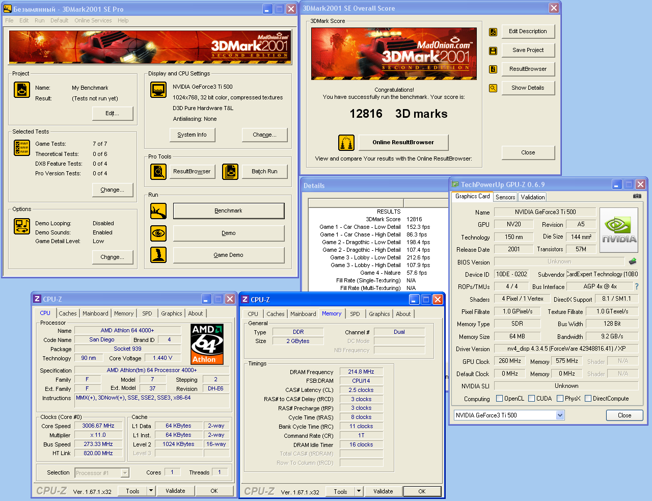 В 2001 марке очень большой разброс результатов. Моя Ti500 на 93.71 набрала 10287. (Еще Ti4200 набрала больше, чем Ti4400 ) Тестирование разных версий давно просится, но пока нет на это времени - все еще разгребаю завалы.