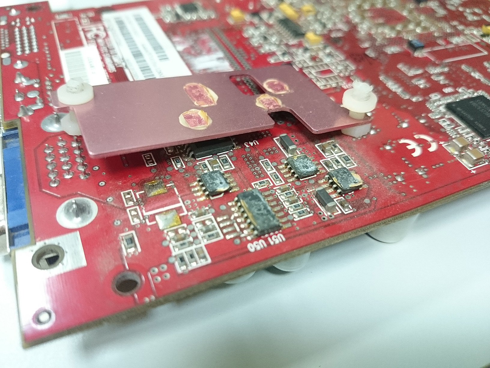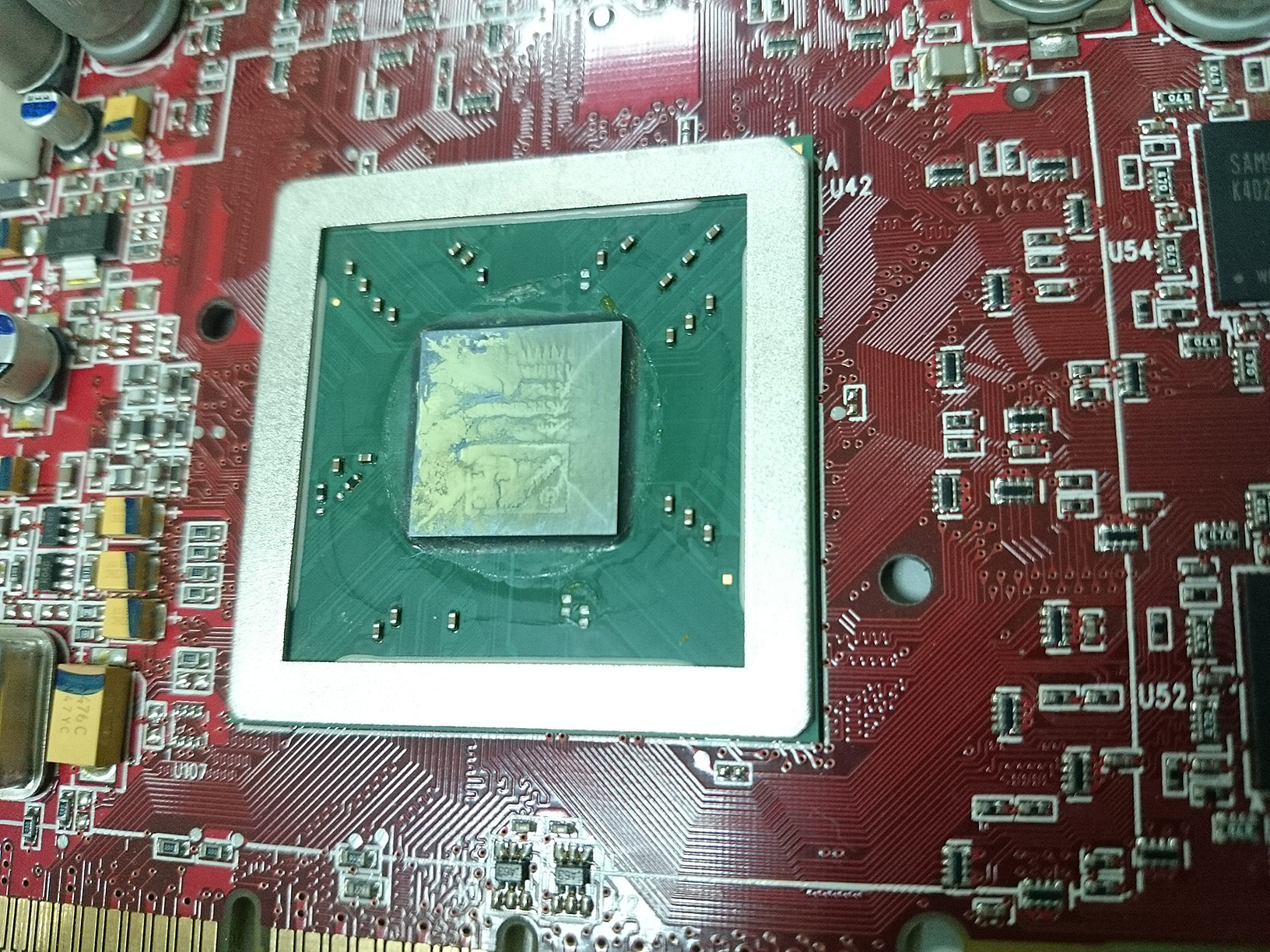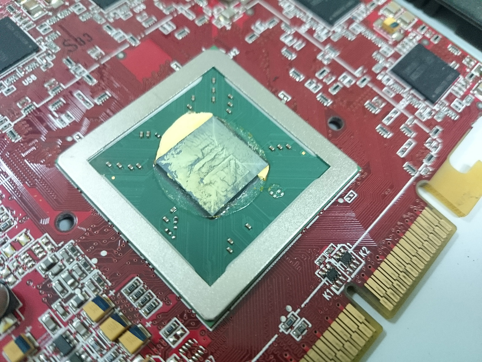 Теперь нужно как-то очистить кристалл, припаять обратно 3 конденсатора и проверить будет ли карта хотя бы включаться. А то может я и ядро от подложки оторвал. При успехе - можно будет греть. Но если честно я очень удивлюсь, если в итоге она у меня заработает.
