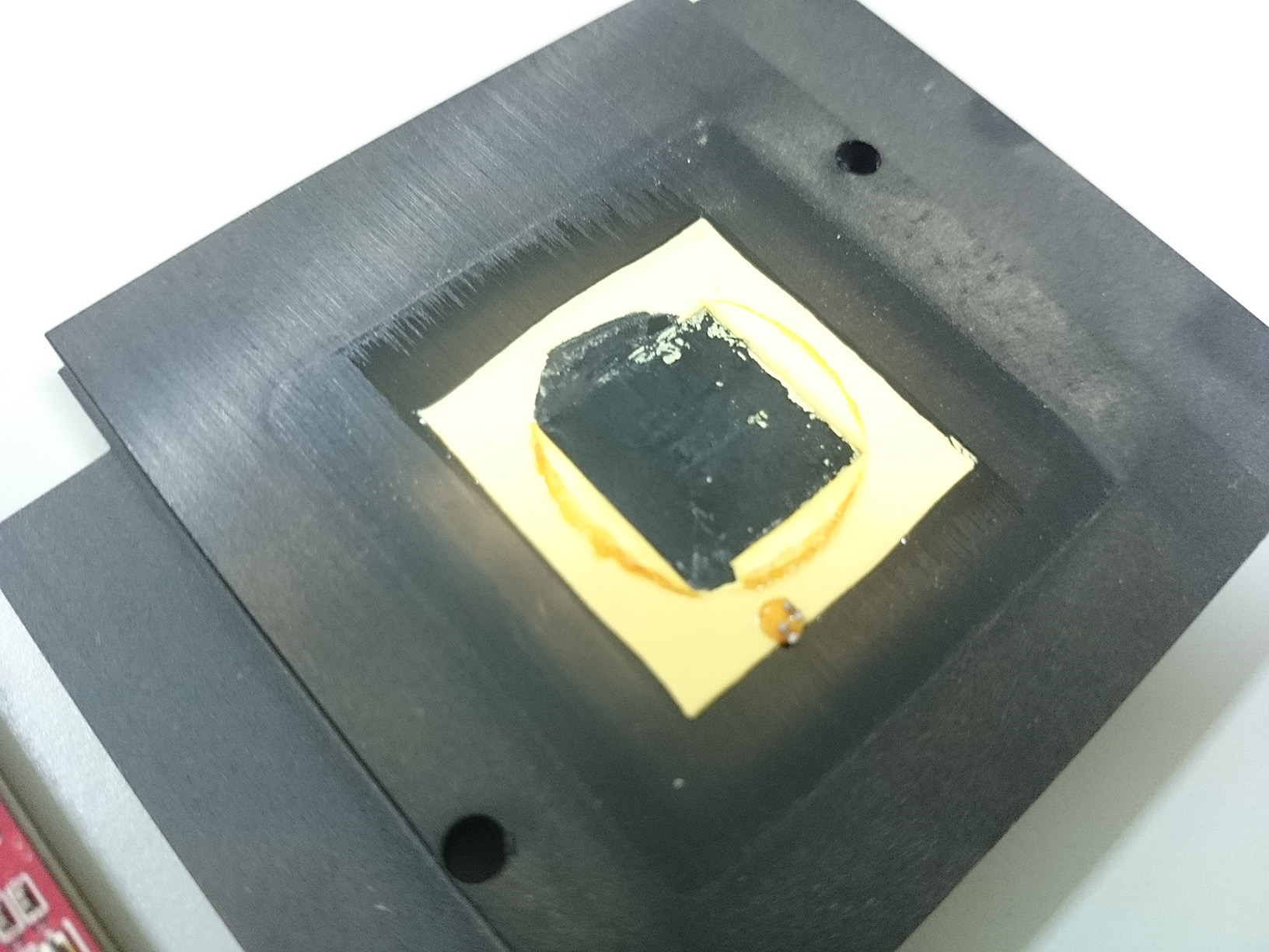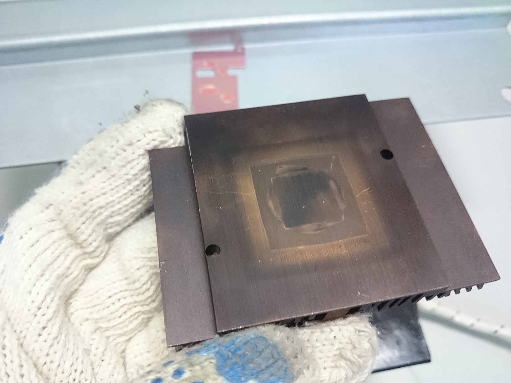 Далее, предстояло снять пластину с обраной стороны печатной платы. Здесь также все оказалось залито этой дрянью. Наученный горьким опытом, я сразу нагрел пластину феном с температурой 400 градусов, слегка поддел отверткой и она легко отошла. Пластину потом почистил также, как и радиатор.