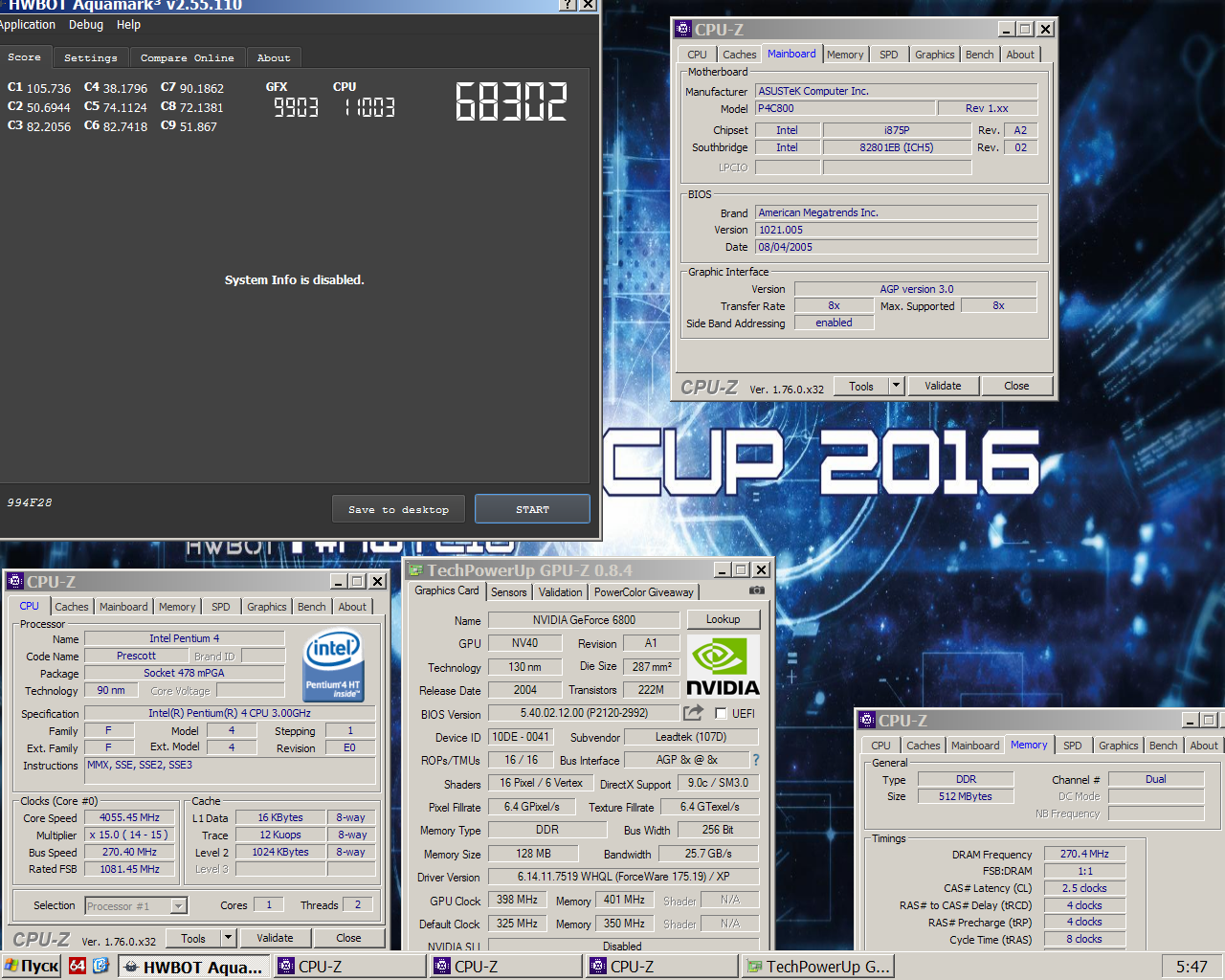 Добавлено спустя 2 часа 41 минуту 1 секунду: А вы знали, что 6800 GT AGP с частотами 410/1100 МГц в 3DMark05 - 3DMark06 эквивалентна по производительности 6800 Ultra AGP с частотами 425/1100 МГц? Я сейчас вот офигел, сравнив свою разогнанную 6800 GT с Ультрой из предыдущего поста. Предварительно отключил Fastwrites (nForce3 + 6800 = привет фризы).