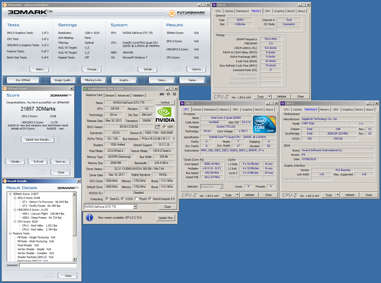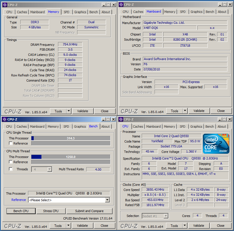 Попробовал немного разогнать Q9550 на X48T-DQ6 - https://valid.x86.fr/9a4zfj С PL8 тянет 400 МГц, с PL10 - 450 МГц. Память конечно не фонтан, 1800 не потянула, поэтому множитель сбросил. Нормальные 1866-е модули бы сюда...