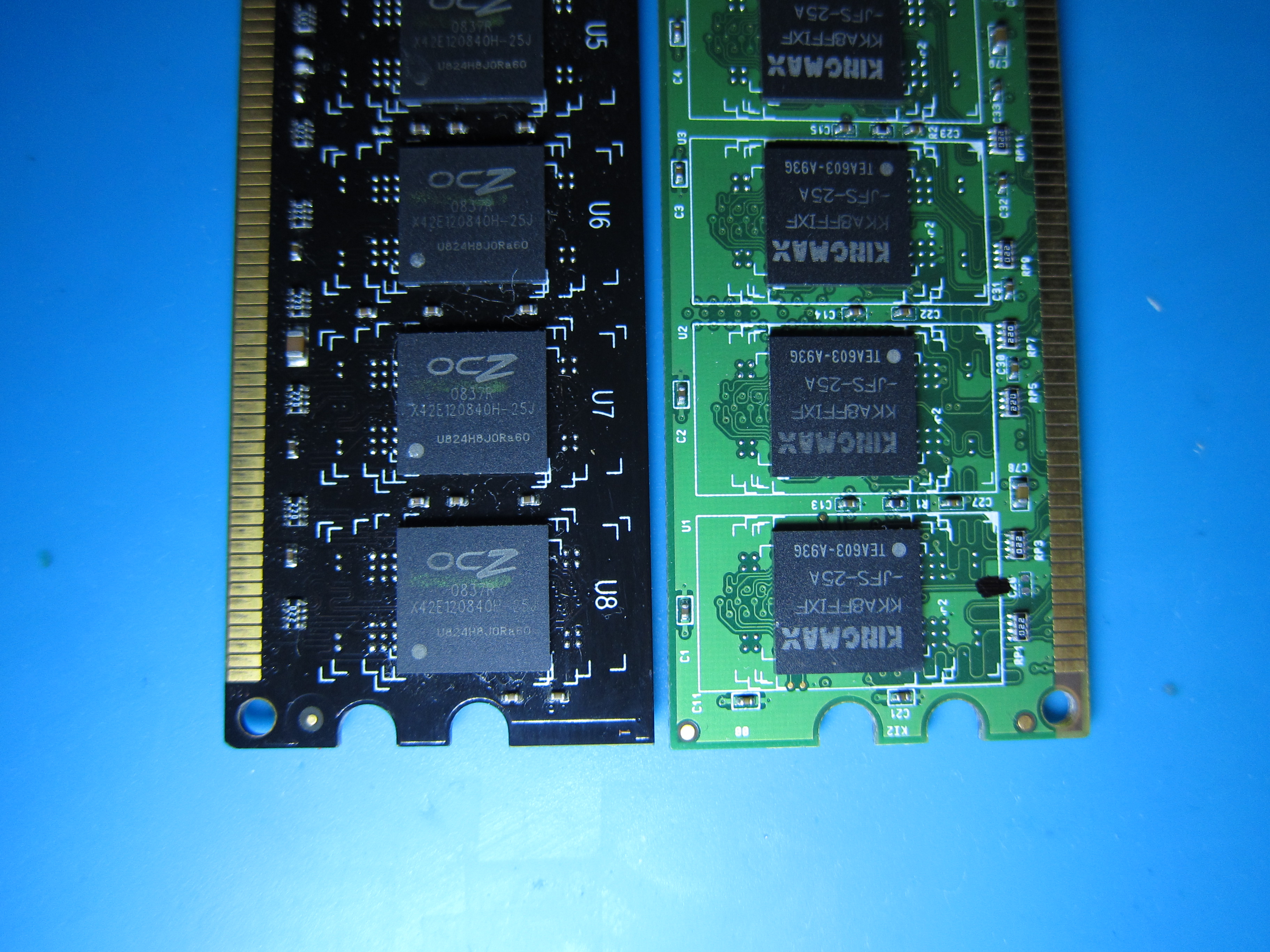 По всем заявлениям в интернете OCZ ставила чипы Микрон последний раз в 2007г. Так что вся память до и включая 2007г. в большинстве имела чипы Микрон поэтому и CL3 были высокие и так далее, после 2007г. перестали ставить Микроны а как на фото выше.