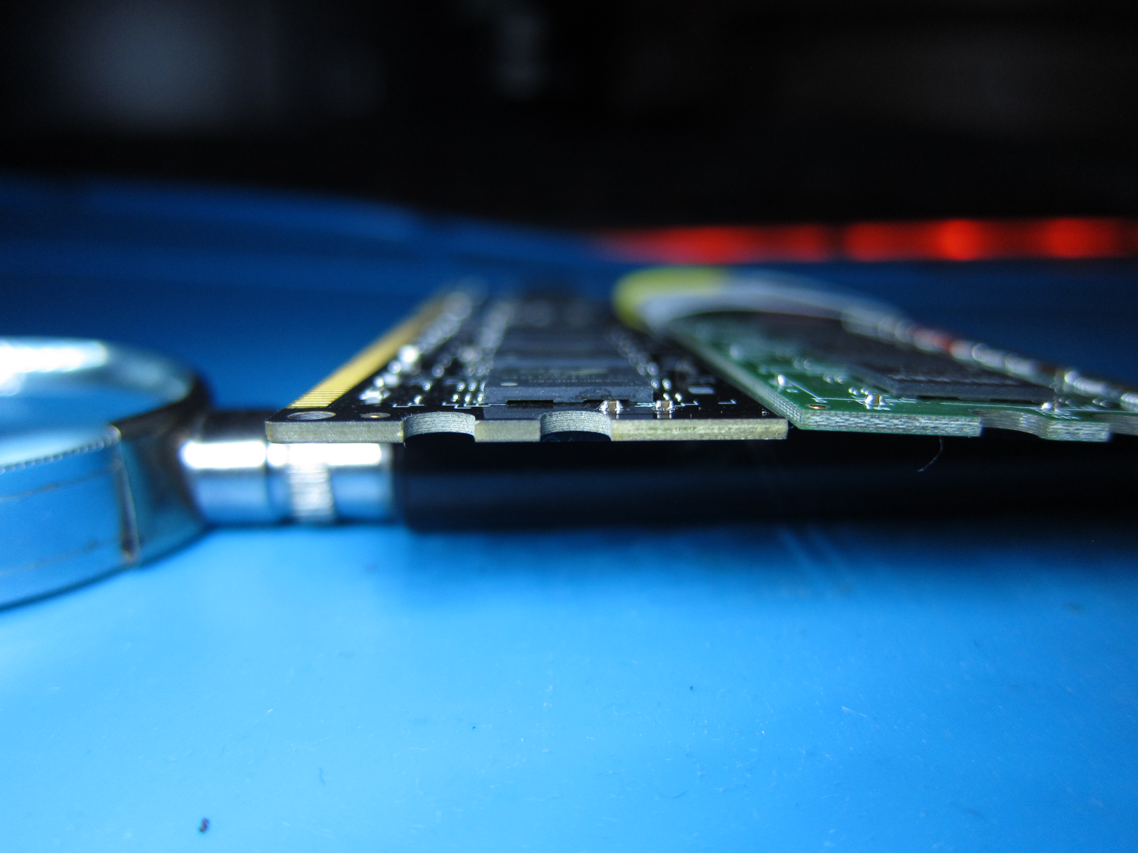 А ноги у чипов были у всех Брэндов поголовно, особенность технологии пока чипы были большие были нужны ноги чтоб перекос устранить, после чипы пошли меньше оставили только по середине полосы во всю длину , когда ещё стали меньше вообще всё убрали и поставили по одному шарику в углах заземление. Трафареты если взять посмотреть для DDR2 то те которые с тремя углублениями это как раз для вот таких с ножками квадратными по сторонам.