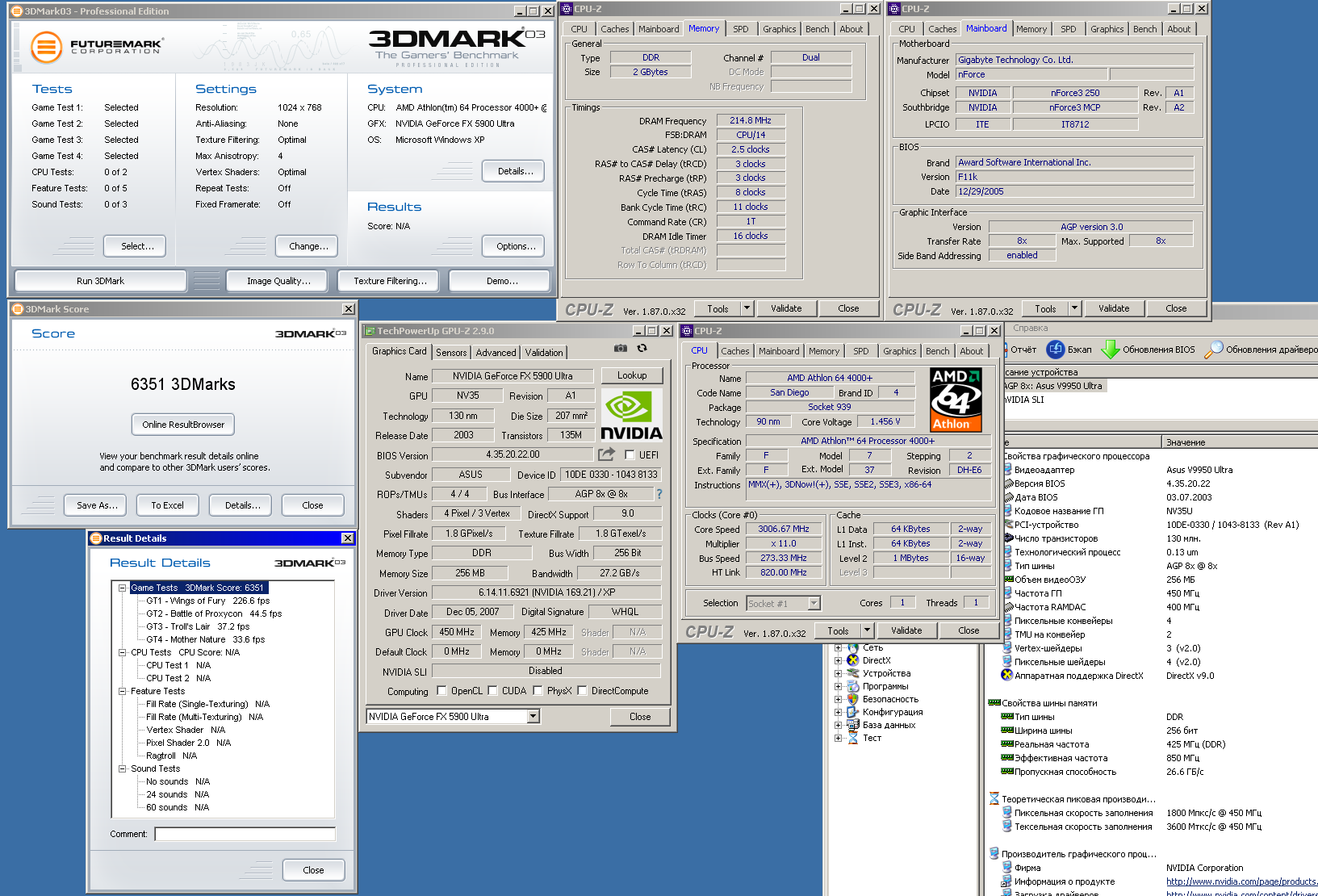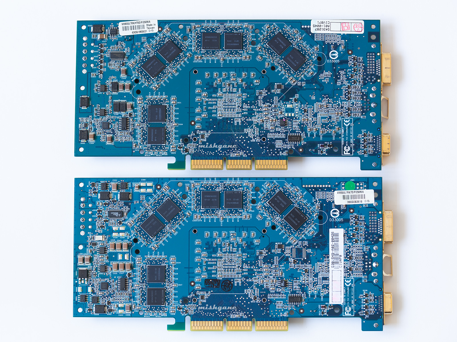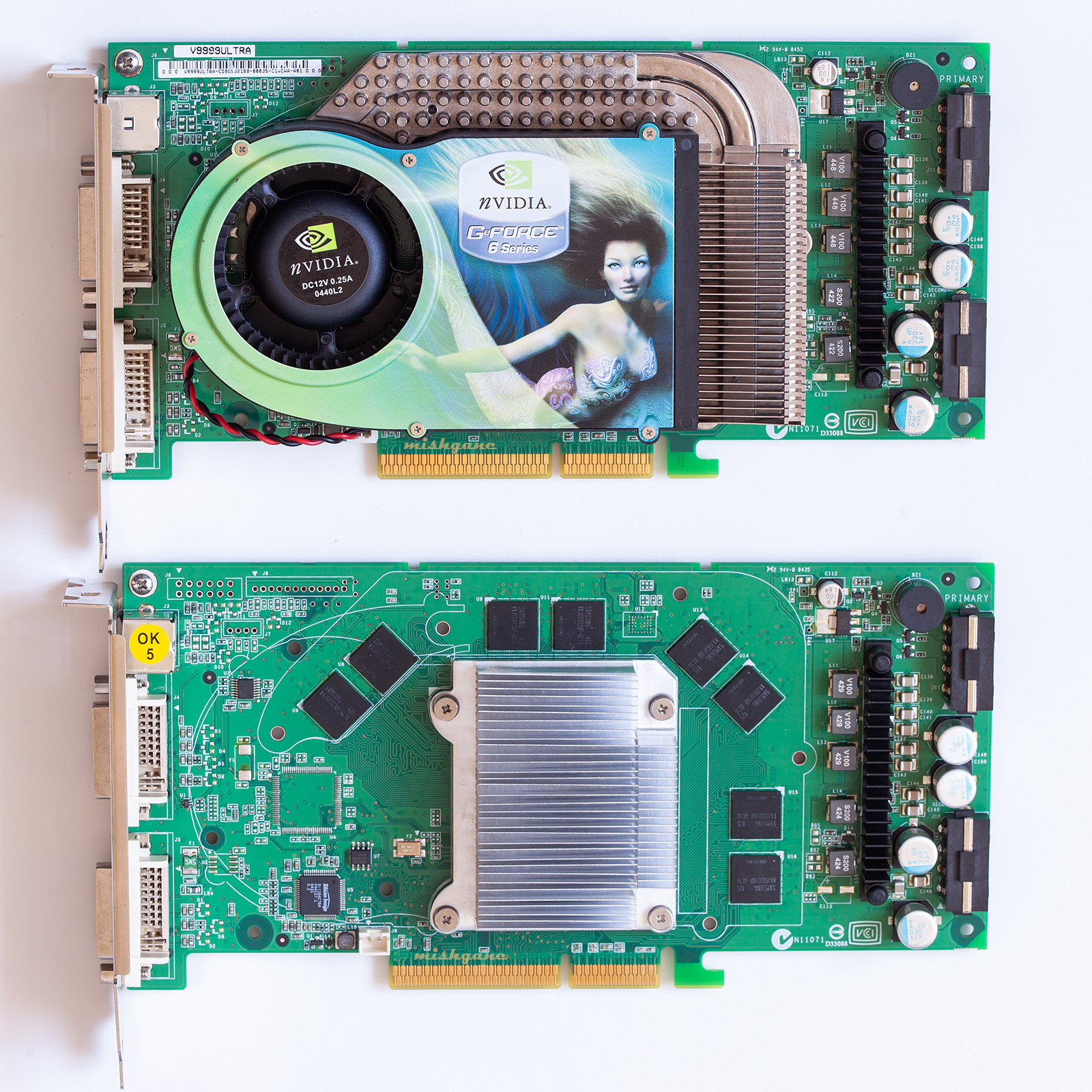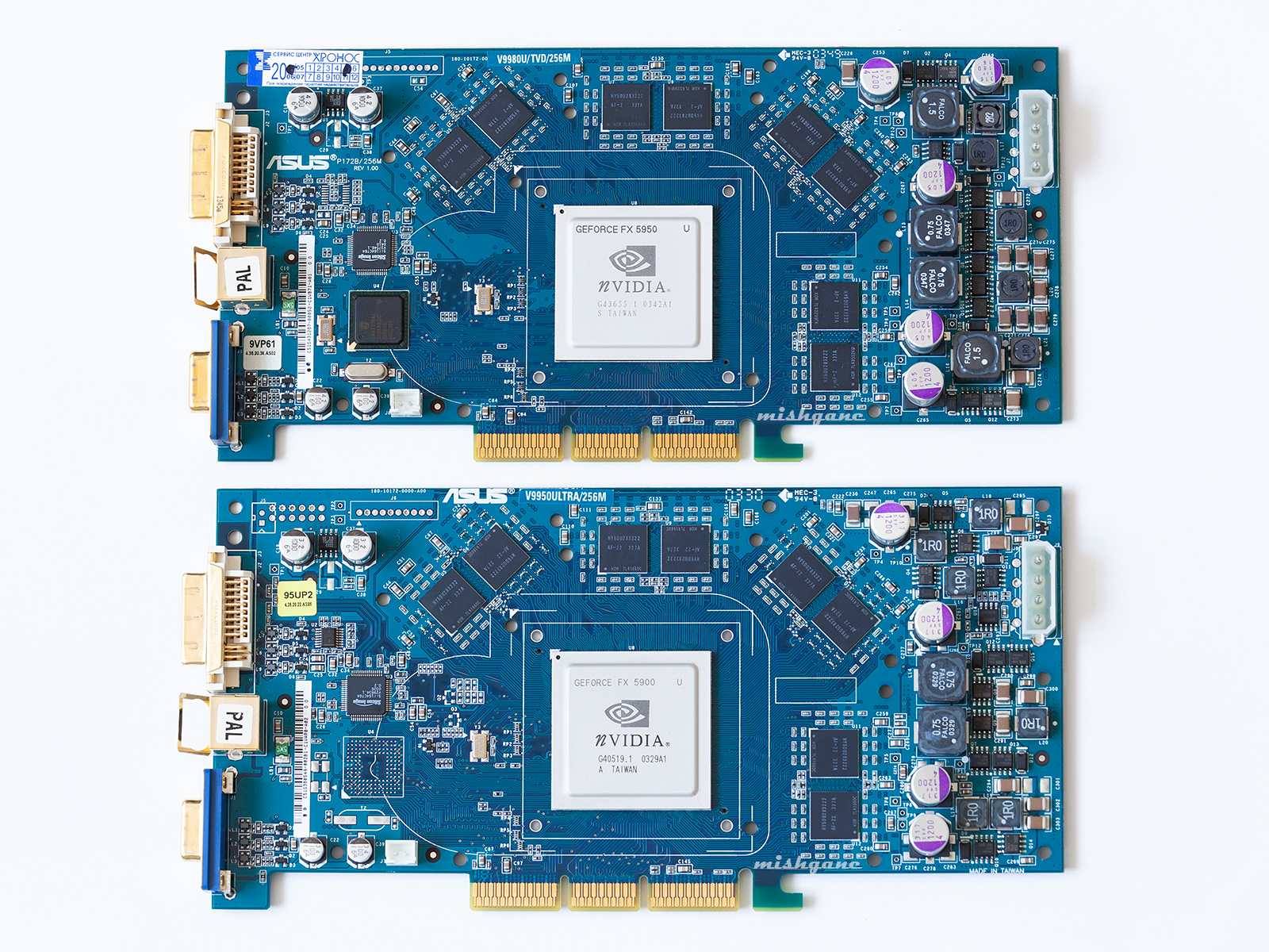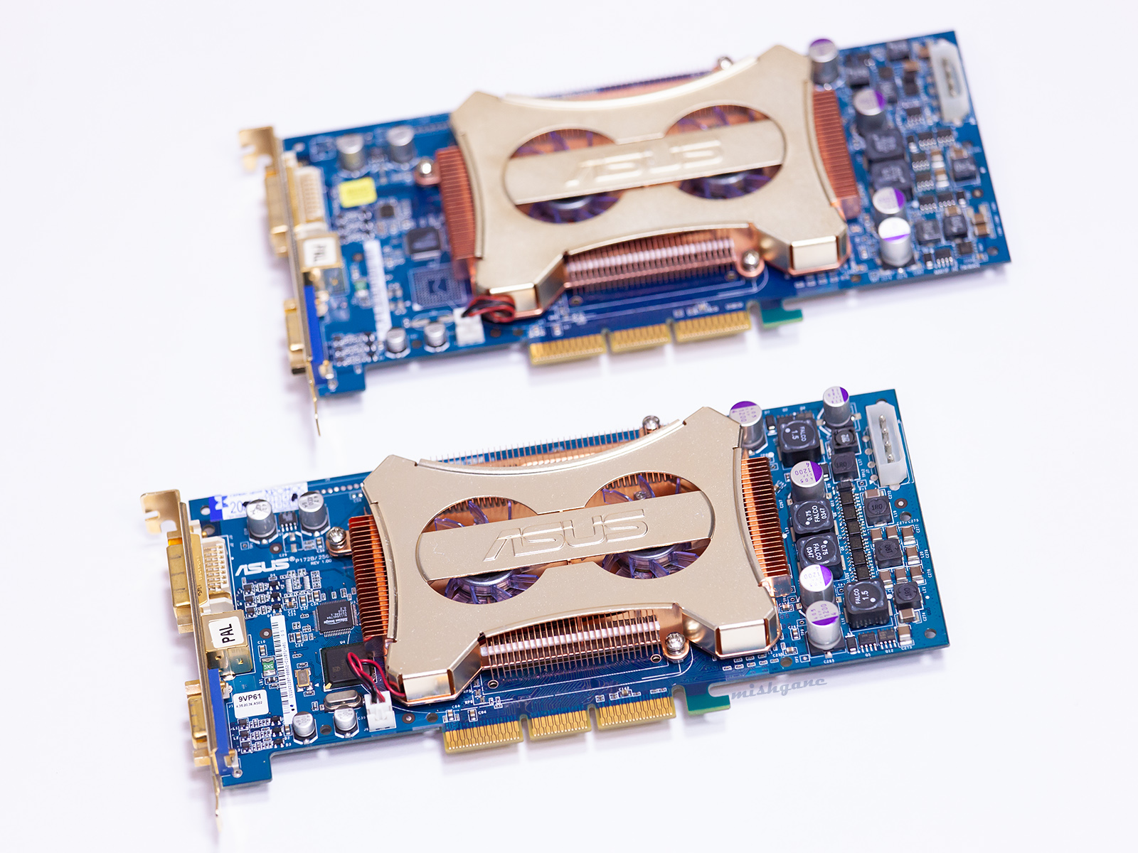 Сверху моя, которую я сначала превратил в кирпич, а потом оживил, заменив неисправный резистор. Тут ее уже показывал. Вернул ей родной биос. Внизу - от oxy_mr работоспособная доска с отвалом башки, буду жарить наверно. Нвидия зажала медный радиатор карте на AGP, который ставился на версии PCIe и Extreme. Надо бы исправить несправедливость, если попадется такой.
