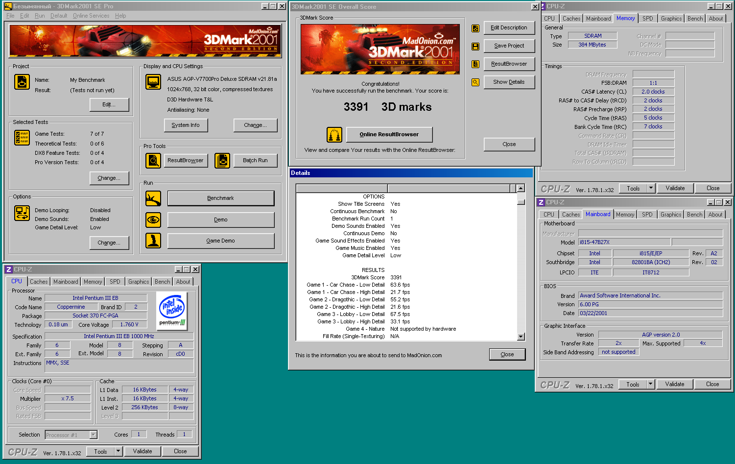 По 2001 марку: TNT 16MB - тест не прошла, в car chase low жуткие аартефакты, high вылетел с ошибкой о нехватке памяти TNT2 PRO 32MB - 1426 GF256 SDR 32MB - 2017 GF256 DDR 32MB - не стал тестировать GF2 PRO 64MB - 3391 GF2 Ultra 64MB - 3635