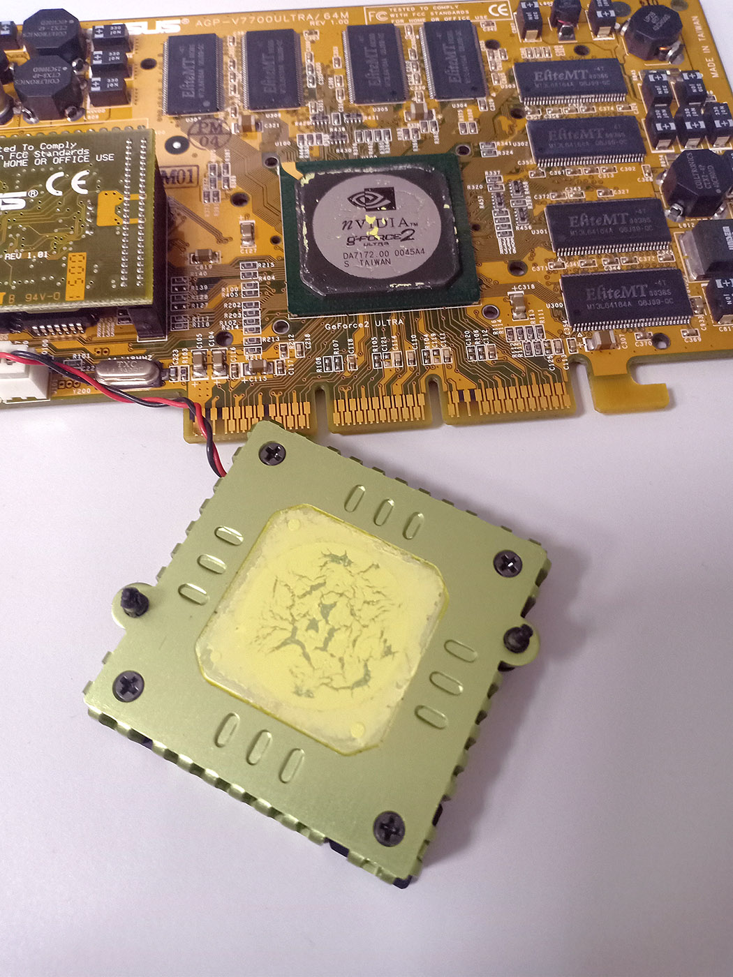 Уже показывал Asus V7700 Ultra. Но на днях разбирал карты и заметил, что два смд конденсатора потрачены. Поставил их от мертвой донорской V7700 Pro, взяв конденсаторы с теми же номерами. На фото можно оба найти. Заодно решил таки снять радиатор. Нагрел до 60 градусов и поддел плоской отверткой. Желтое говно оттер 646 растворителем - та еще гадость, вот тут перчатки и вентилляция строго обязательны, и лучше в квартире с ним не работать, выходите в подъезд/на улицу. В завершение экзекуции разобрал вентилятор, почистил и смазал его консистентной смазкой, теперь идеально работает.