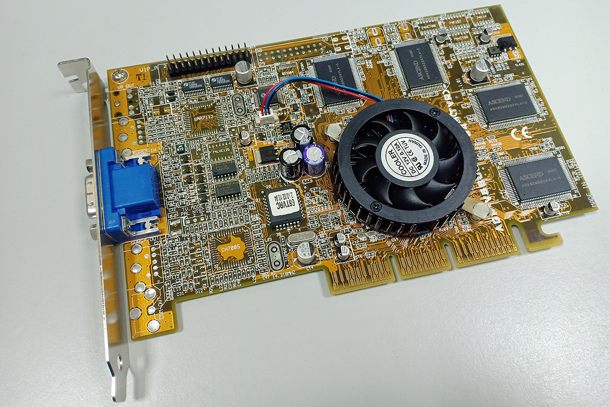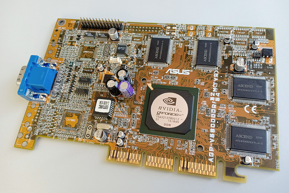 А вот тут еще одна моя V6800 - можно наблюдать, что печатная плата другая совсем, с разводкой под DVI, а не 3д-очки. И 32 МБ памяти набраны 8 чипами вместо 4. Еще та глючная, а новая - нет.