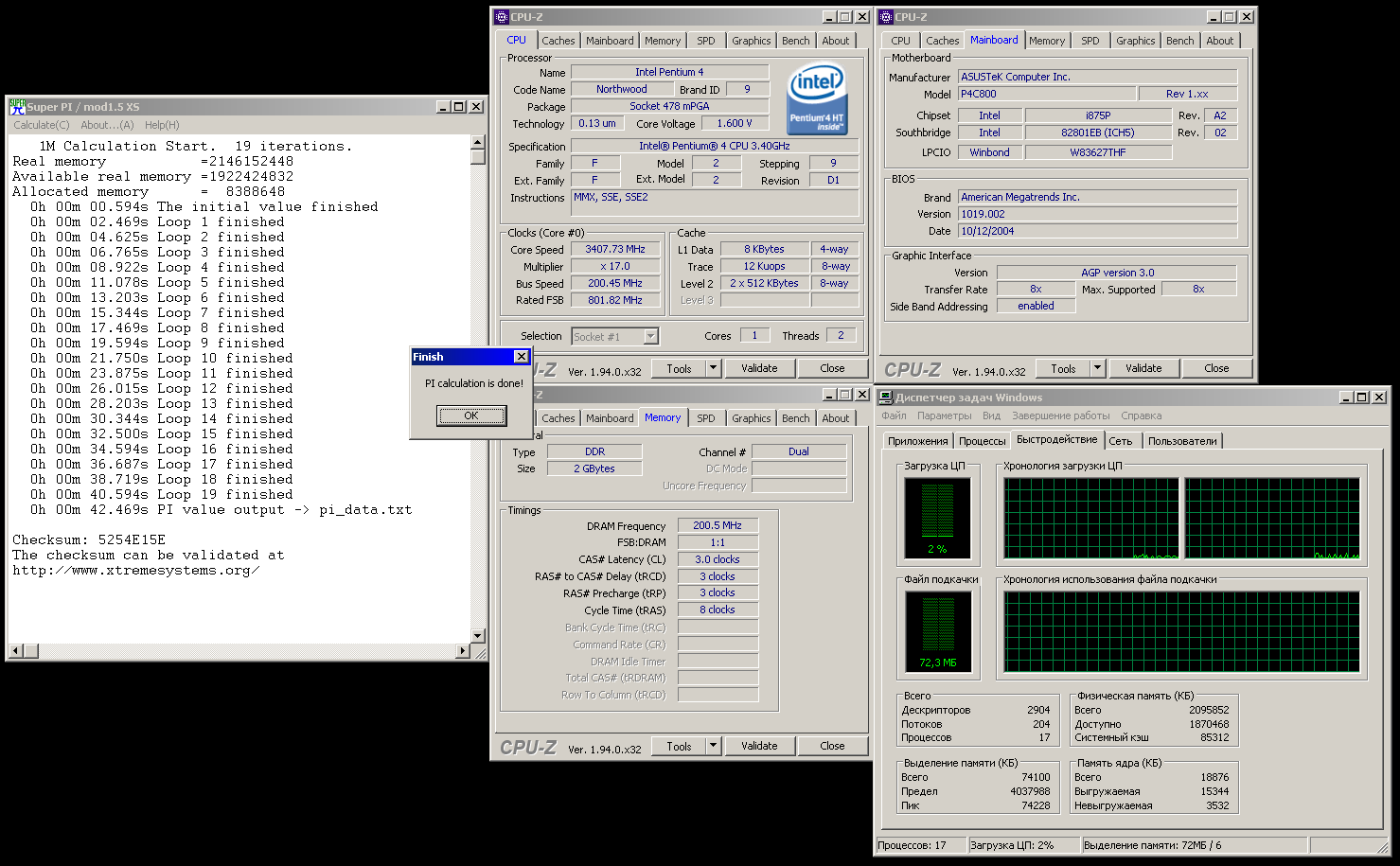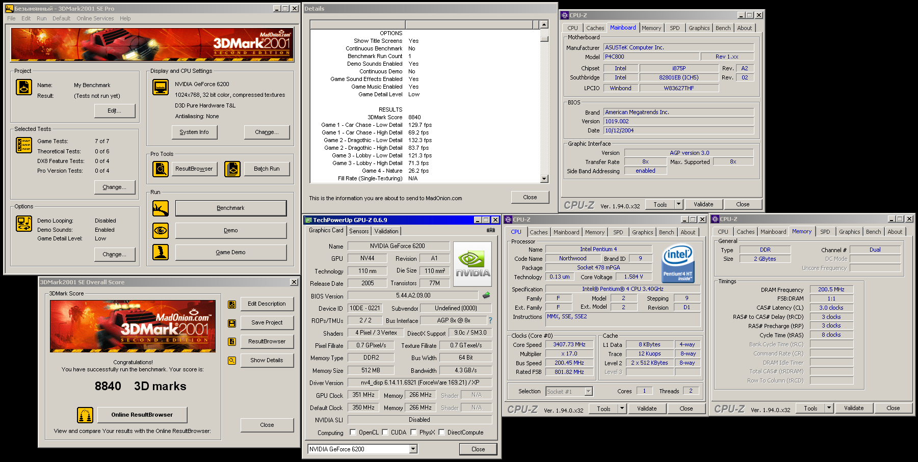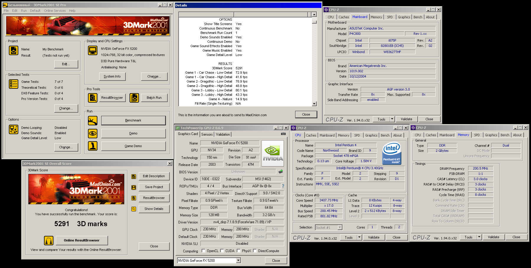 Попробуй также хотяб в дефолте на памяти также проверить результаты с низкими таймингами 2-2-2-5. в супер Пи и 2001 марке должно добавить, в остальных лучше не тратить время. Процессор хороший у меня за всё время выше 2.8 не было. Но я не гнался за поисками топа. 875 то я себе купил в прошлом году, второй в жизни, первый убил 10 лет назад, как первая материнка 478 для разгона была куплена, за 10 лет уже 6 штук 865 улетели в мусор. Блин единственный сокет который у меня умирает постоянно. Ни один другой так не мрёт.