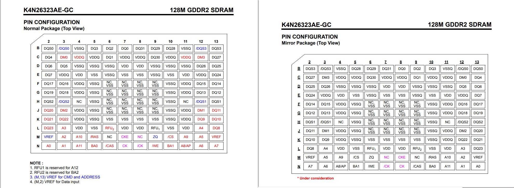 Без разницы все квадратные чипы GDDR1 - GDDR2 - GDDR3 которые X32 имеют 144 шарика и полностью аналогичны по сигналам. А X16 имеют 84 шарика и полностью идентичны с распиновкой обычной DDR2 X16.