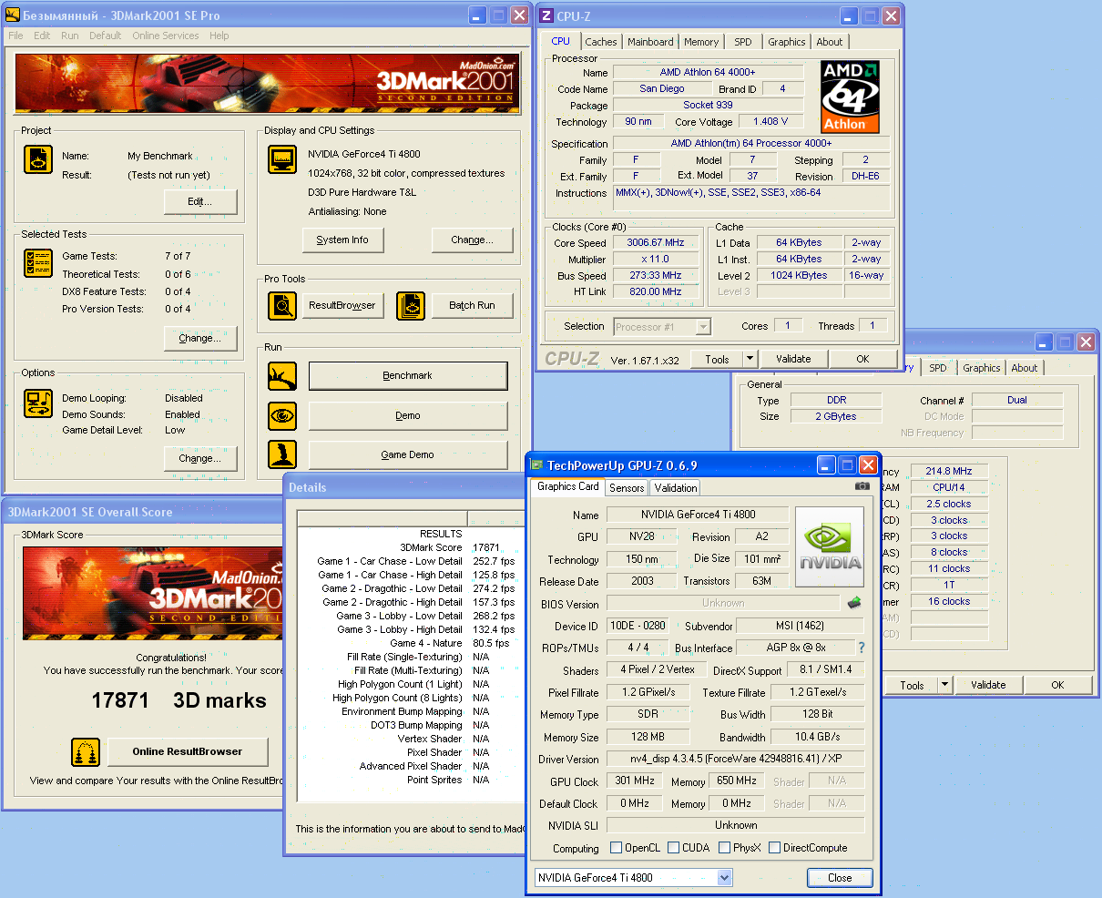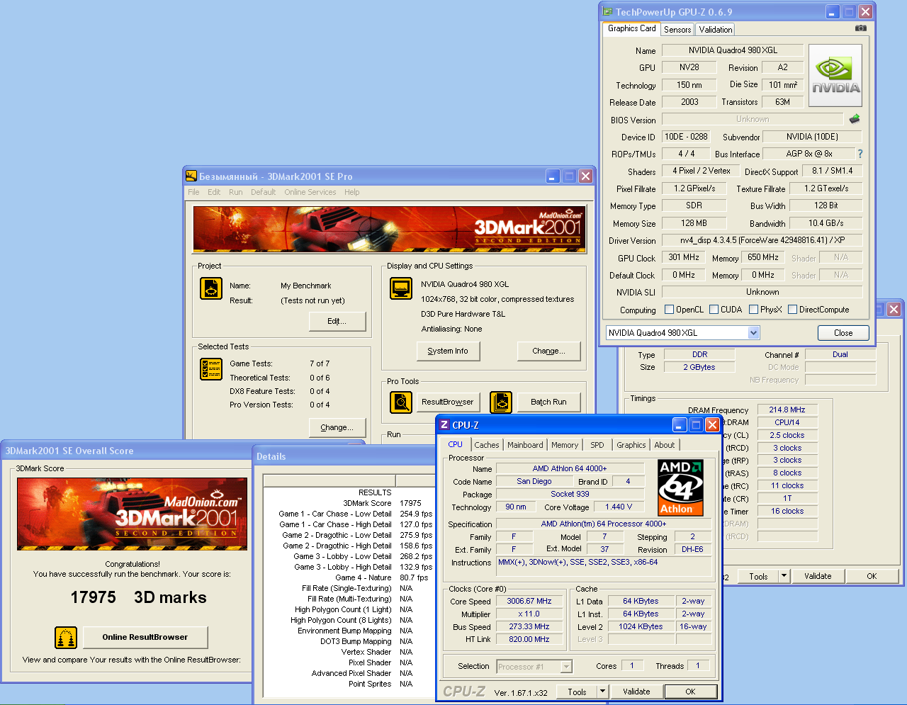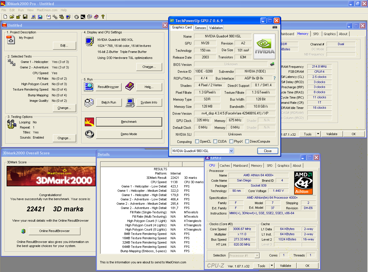 На одинаковых частотах 301/650 МГц Asus V8460 Ultra Deluxe на той же системе была медленнее ровно на 100 попугаев, такая вот реальная прибавка от 8X