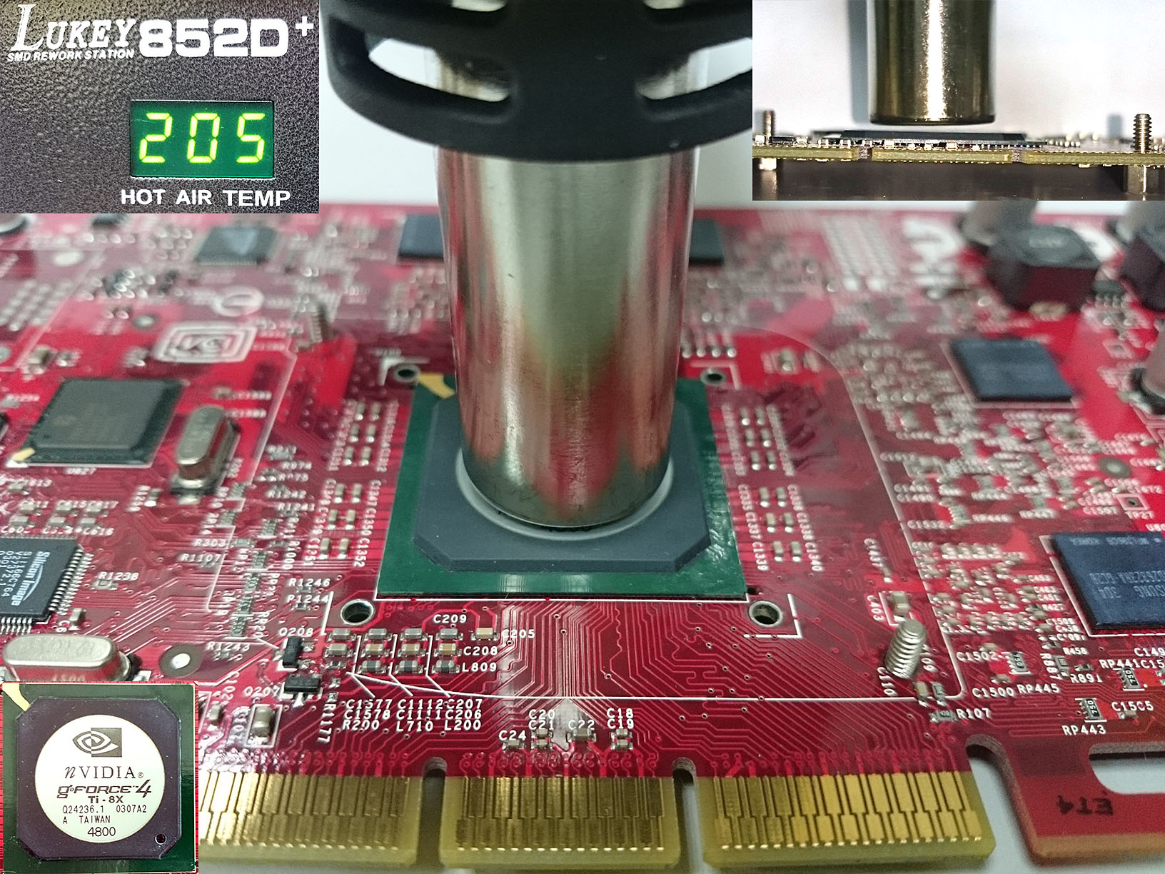 Наверно попробую у кого-нибудь на ИК-станции с флюсом аккуратно прогреть чип. Теоретически у меня аж 3 донора есть - 2 квадры 980 и одна Ti4800, у которой КЗ либо в чипе, либо где-то в слоях текстолита.