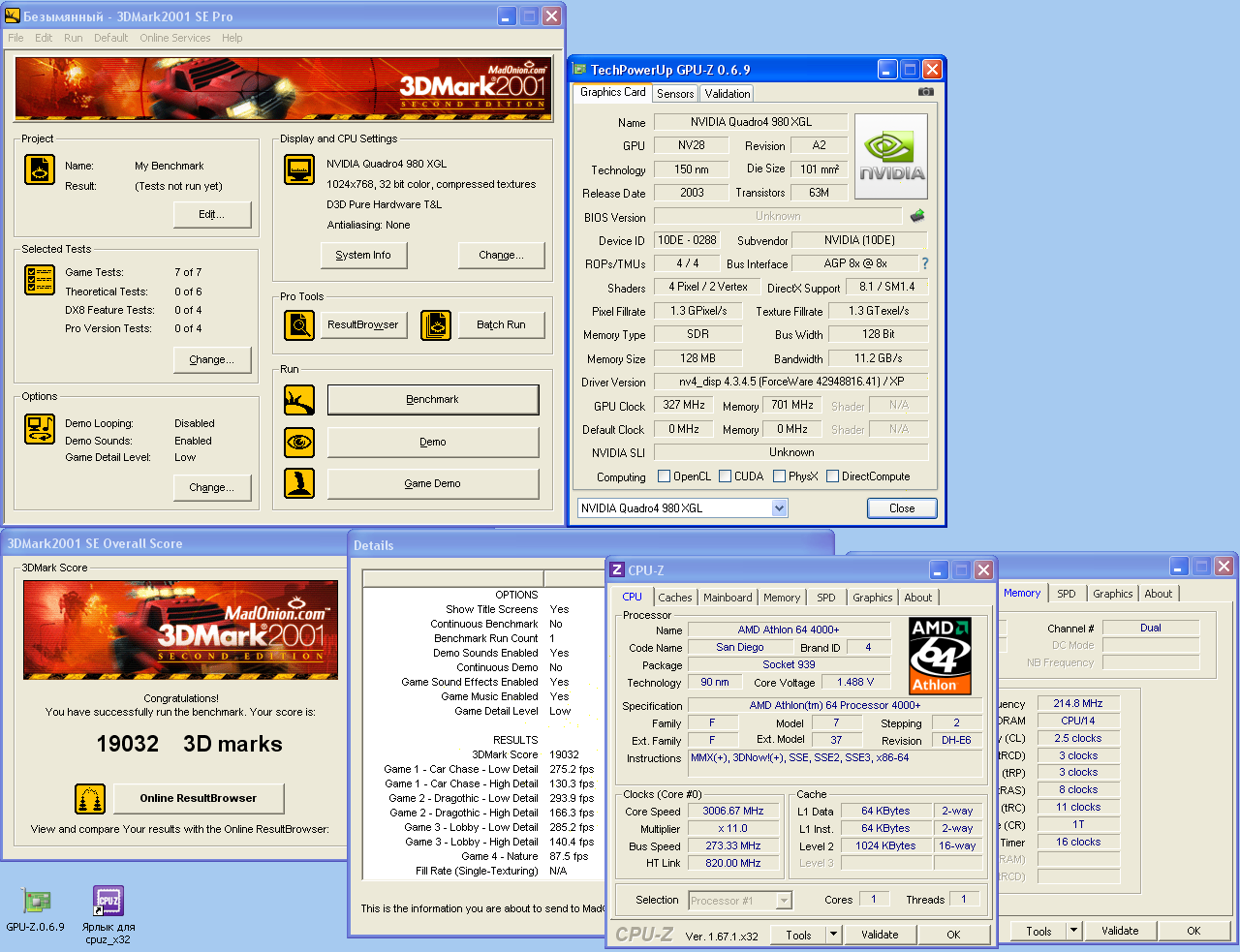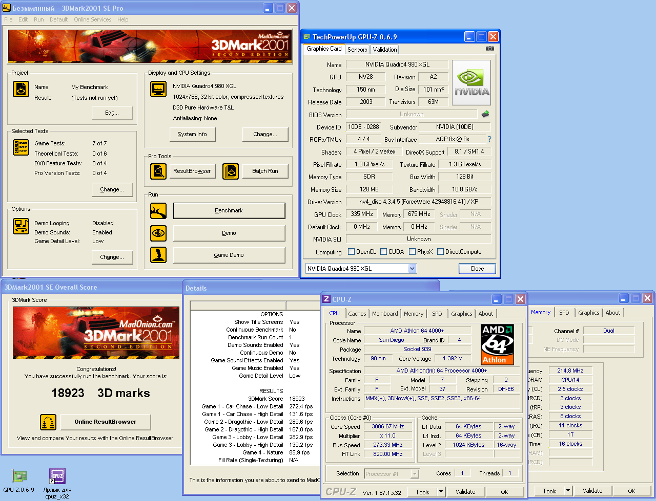 В 2D работает, но есть небольшие артефакты в виде выбитых пикселей, как при прохождении POST, так и на рабочем столе. На скриншоте это заметно. В 3D работает, но есть множество артефактов, особенно в 3DMark03. Результат в бенчмарках несмотря на это выдает нормальный. В 3DMark2001 SE артефактов чуть меньше, но все равно очень много, а вот в Quake III: Arena и 3DMark2000 их почти нет. Полный двухчасовой прогон Video Memory Stress Test выявил пару ошибок по памяти, но думаю дело все-таки в чипе. Драйвер 43.45 - поставился без проблем, а 81.98 сразу после установки приводил к сильным фризам ОС.