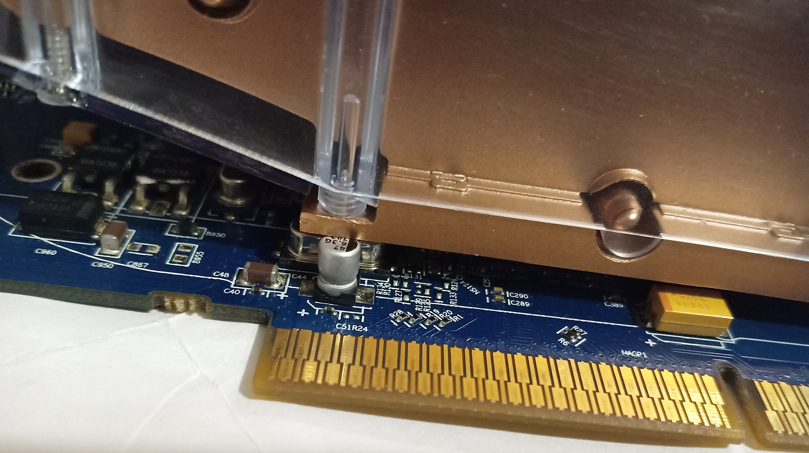 Словил я тут глюк. Поменял кулер на Ti 200, поставил в 775dual-vsta и начались ребуты при запуске 3D. Ну я конечно подумал, что кулер криво встал или отвал GPU. Но на другой матери она работает. Другая видюха на этой матери (vsta) так же заработала. Потом снова поставил ti 200, но с DDR1 памятью и все заработало. Стал модули перетыкать и оказалось, что 2й DDR2-слот глючный. Осмотрел слот, почистил на всякий, так же сокет осмотрел, поменял проц. Увидел, что пластиковая клипса радиатора на NB сломана и радиатор перекосило. Может северник частично сдох? Пока не понял что с ней случилось, мб что-то повредил из-за того, что на столе собираю...