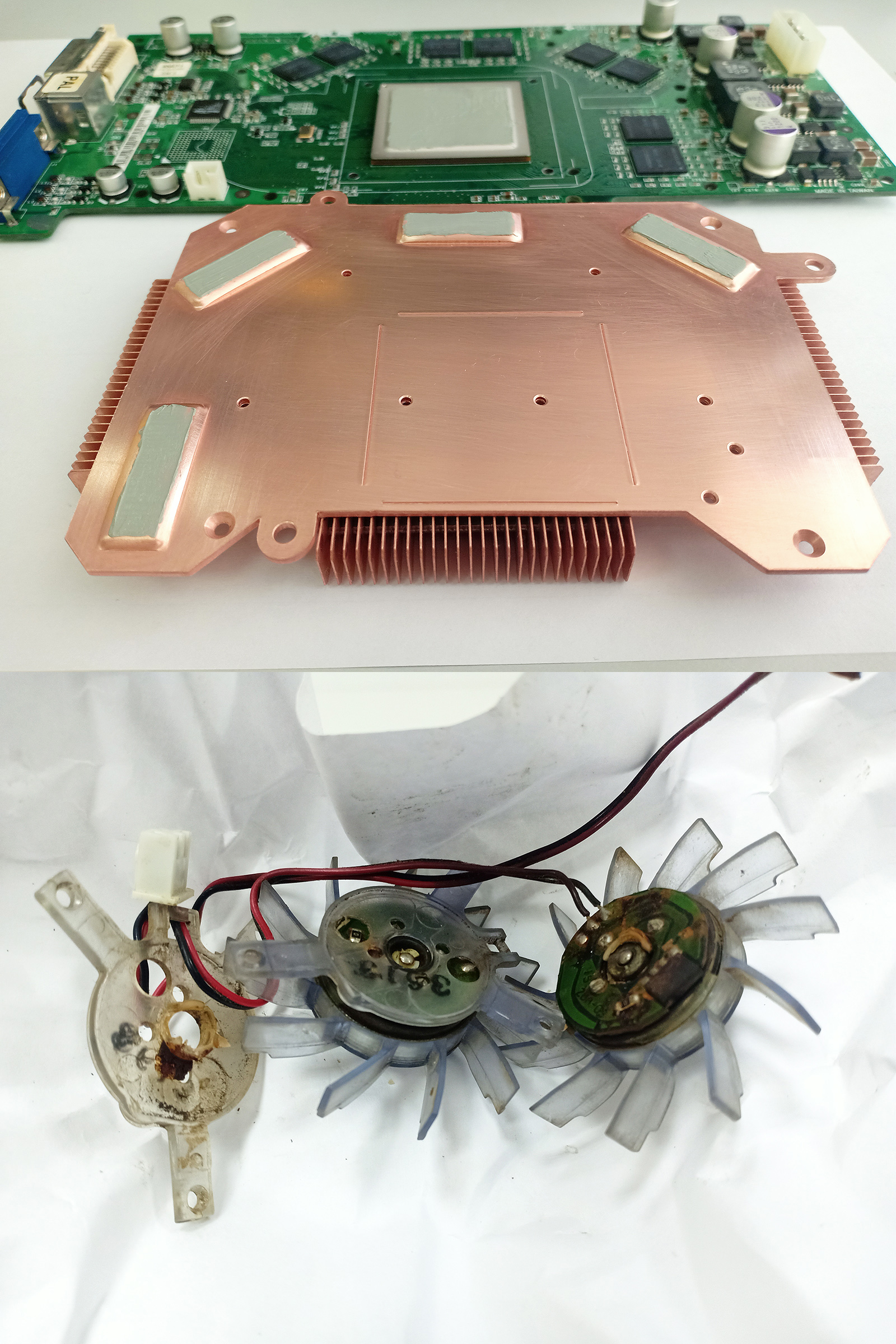 Эфыксы уже некуда класть, но внезапно спылесосил еще один. Карта была в печальном состоянии и даже не давала картинку. Отмыл плату от грязи и подобия термопасты своим эффективным способом, особое внимание уделив пространству вокруг чипов памяти и промывке шаров гпу и памяти. И, о чудо, она заработала. Вентиляторы рассыпались и были в каком-то масле и говне. Надо будет у китайцев заказать что-то похожее. Эти, пожалуй, на выброс. Хотя может получится и гибрид сотворить. Радиатор также привел в надлежащее состояние. Но как - говорить не буду, для любителей промывать платы соляркой это лишняя информация.