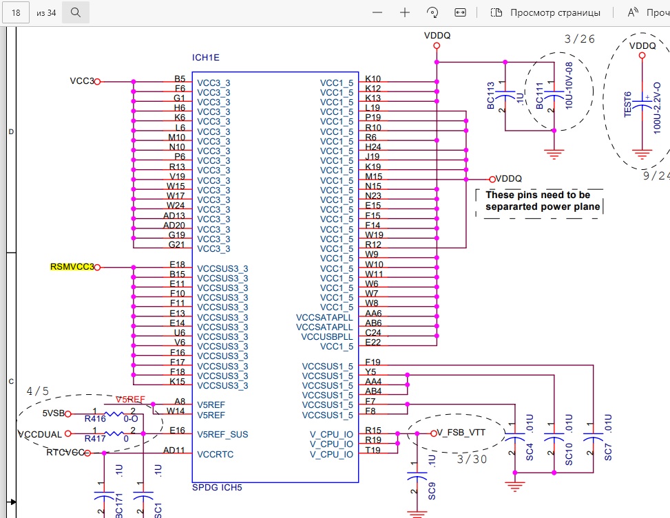 http://schematic-x.blogspot.com/2018/04 ... files.html Ну или гуглить по "ECS 865GV-M8 REV 3.1D.pdf" Просто внятнейшая схема от ЕЦС, а не какого-то богомерзкого простихосподи асуса. Внимательнейшим образом смотришь куда заходит RSMVCC3, который делается точно таким же 3-х ногим стабилизатором типа LD1084 допрыгиваешь до страницы 18 и видишь, что половина соединений уходит не на ПСИ/АГП прочую ерунду (необходимую исключительно для пробуждения из стендбая по сигналу от устройства, типа сетевки - ее в дежурке тоже питать чем-то нужно) А внезапно, в ICH5 ака_южный мост. Сетевке рядом стабель не нужен, у нее свой стабель на борту. Нормальные люди всегда ставят стабель у потребителя, а не где получится. Стабильность 3,3В нужна в первую очередь южнику, ибо это и есть его стабель. Что ему делать где-то под АГП?