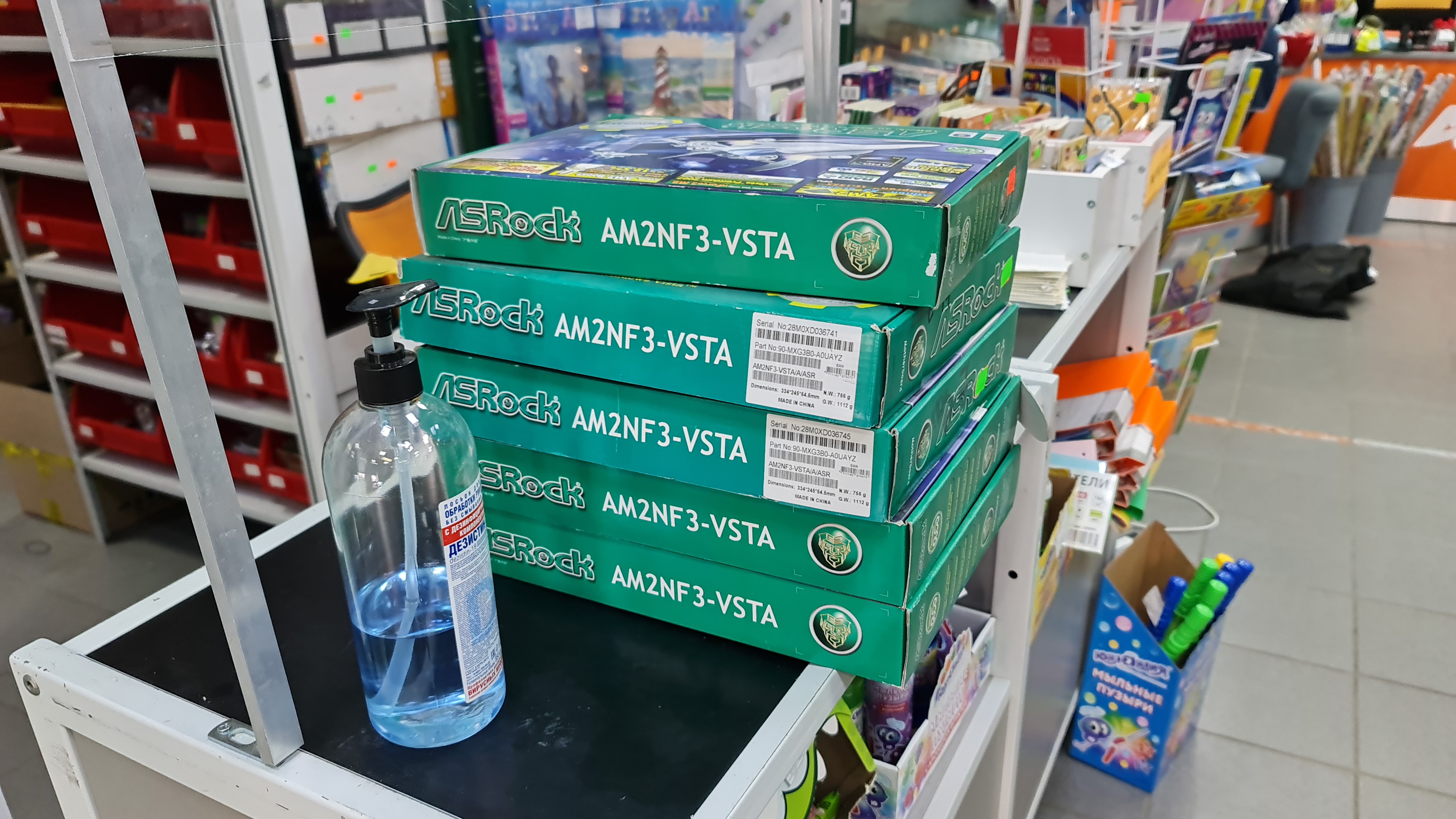 Нет, магазин, в котором я нашёл это сокровище, раньше занимался технической поддержкой. Теперь торгуют канцелярией и товарами для детей. На фото видно. А материнские платы лежали у них в качестве неликвида. Ещё сильно удивились, зачем они мне нужны. Так что, это не "чувак", а организация. Ну ладно, самое интересное у меня впереди. Есть два набора DDR2 по 2 ГБ и по 4 ГБ на планке. Плат много, можно будет сравнить оба варианта.