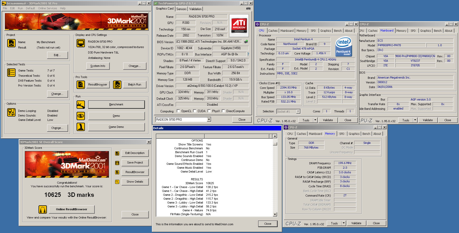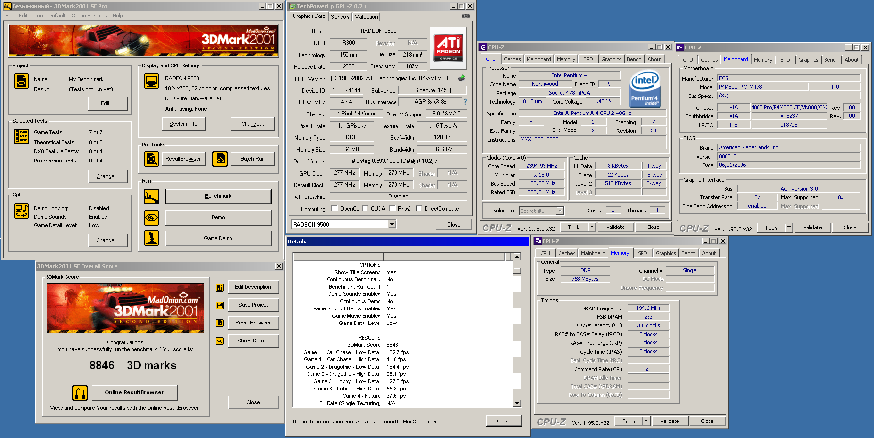 mishgane у меня сейчас как раз похожая системка! только агп х4 и радеон 9600. ну еще и шина фсб снижена до 194мгц на 12 множителе. тк материнка с 800мгц пнями зависает в рандомном случае. сейчас попробую найти скачать марк 2001 и прогнать с такими же настройками.