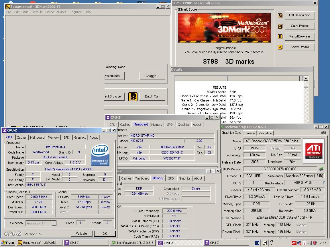 У меня тоже почти такой же тестовый AGP, только 865 чипсет. Надо в одноканале сегодня прогнать. Драйвер 10.2 правда слишком для 2001. Но попробую такие же. Настройки драйвера видимо дефолт.