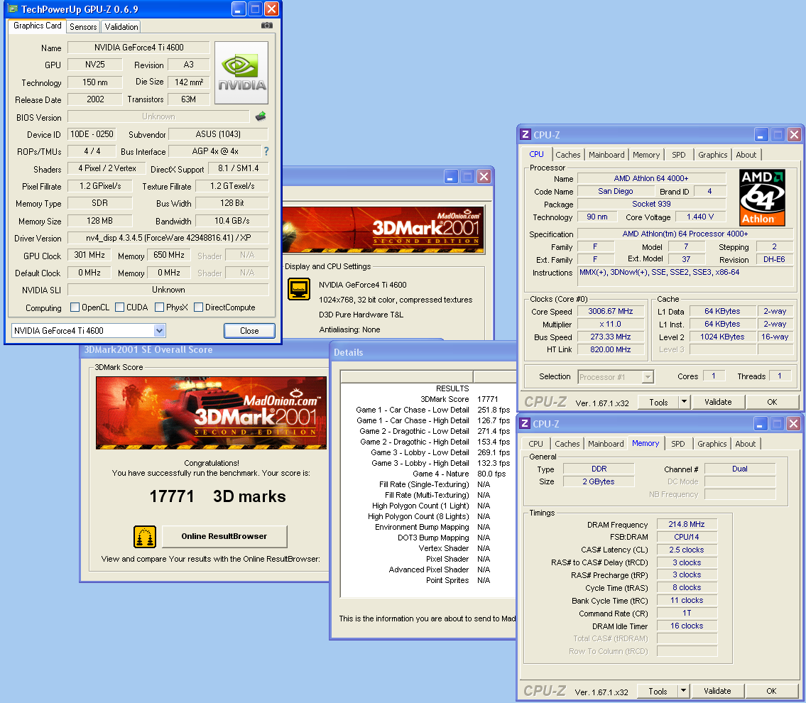 А есть какая-нибудь другая карта? Попробуй например GF4Ti4600 на 43.45. Если будет близко к XP, то дело в дровах на видео. Должно быть не менее 18000 в 2001.