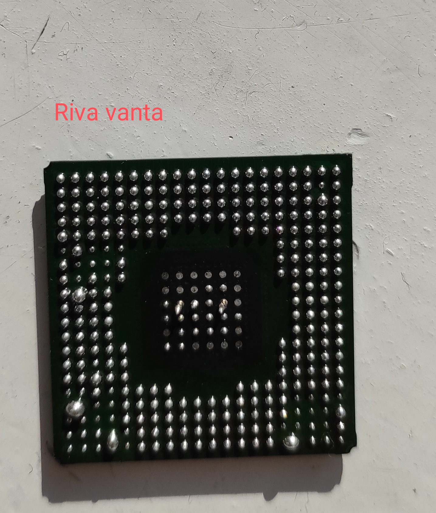 Romze$ , я в свою очередь пытался "покатать на шарах" Радик 9800про который мне продали "на блошиныном рынке" в состоянии Рабочий !, клянусь соседским поросёнком. А по факту почти все в артефактах. После прогрева феном с флюсом какое либо изображение вообще пропало к счастью мать жива. Как я понял позже при кипении флюса и покачивании шаров есть нежилых шанс их слипания. Ниже фото где уже я экспериментировал снимать ГПУ с Атсусятины V3800. Как видно хоть шары расположены достаточно далеко шанс слипания велик, а мб моё рукожопство.