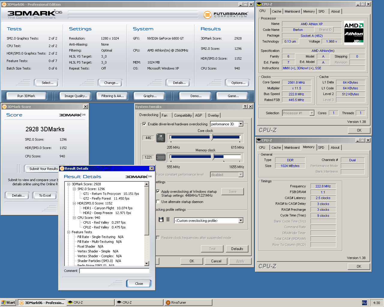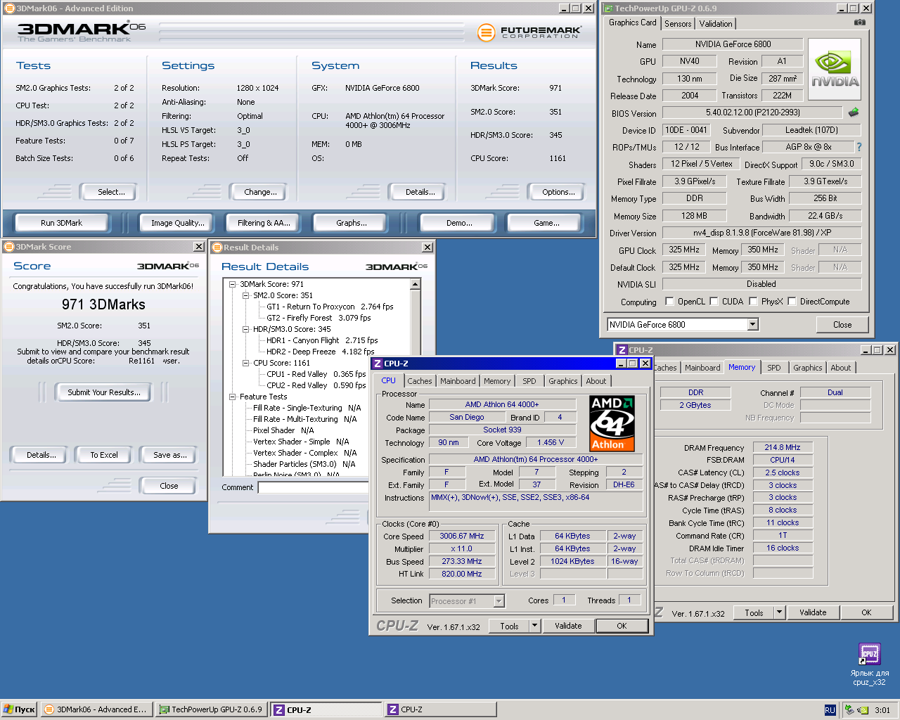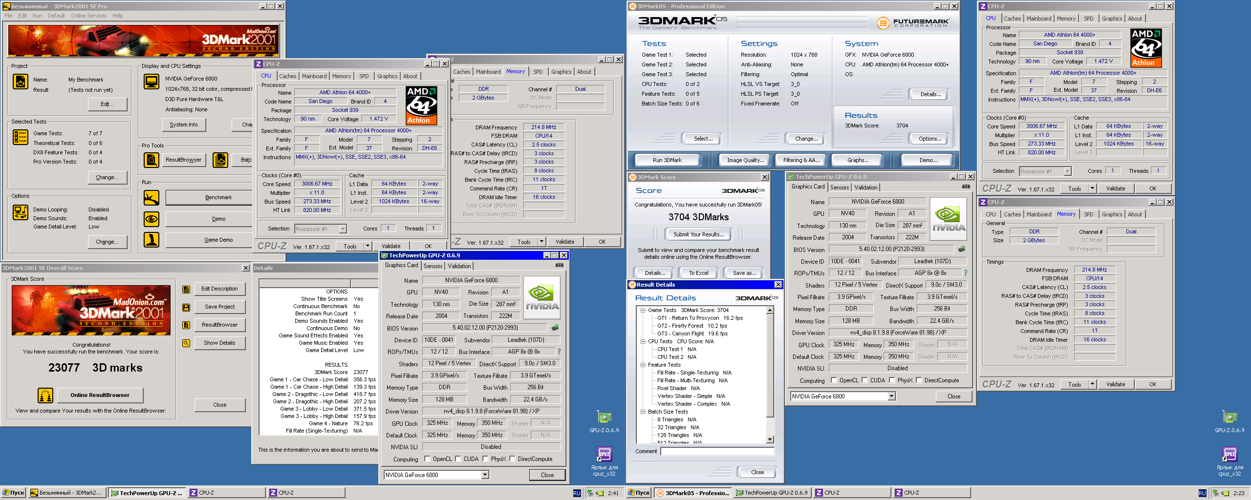 частота HT сильно на резы не влияет, могу для справки без скриншотов написать цифры драйвер правда 81,85: 6800Ultra AGP полный дефолт+ Sandiego ~2700Мгц 01: 20,5k 03: 7,5k 05: 1,5k