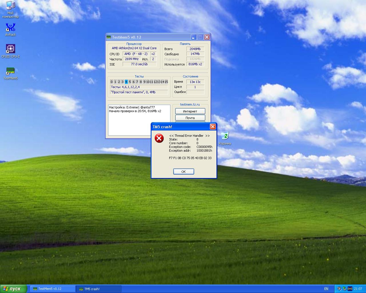 Доброго времени суток. Тестировал систему АМ2 + AGP, при чем минув стадию проверки в стоке сразу начал тестить в разгоне. Тестил ТМ5 пресет "@anta777" , что выдало крит ( ниже скину скрин).