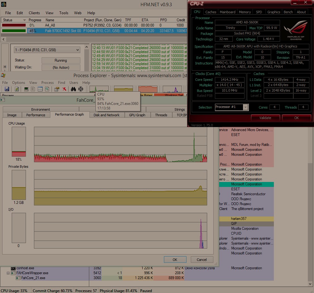 Еще один момент. Насколько я вижу из первого скриншота, процессор у вас 4хъядерный. Один поток отдан GPU-слоту (Juniper HD 5750), три потока - CPU слоту. Это нормально. Но вы должны отдать более высокий приоритет процессу FahCore_21.exe (чем Idle, ожидания, который изначально стоят для F@H-ядер), дабы избежать протормаживания на проверках целостности задания, когда 21 ядро врубает несколько потоков. Делать это необязательно, но я всегда так делаю, когда процессор занят чем-то другим, кроме GPU-счета