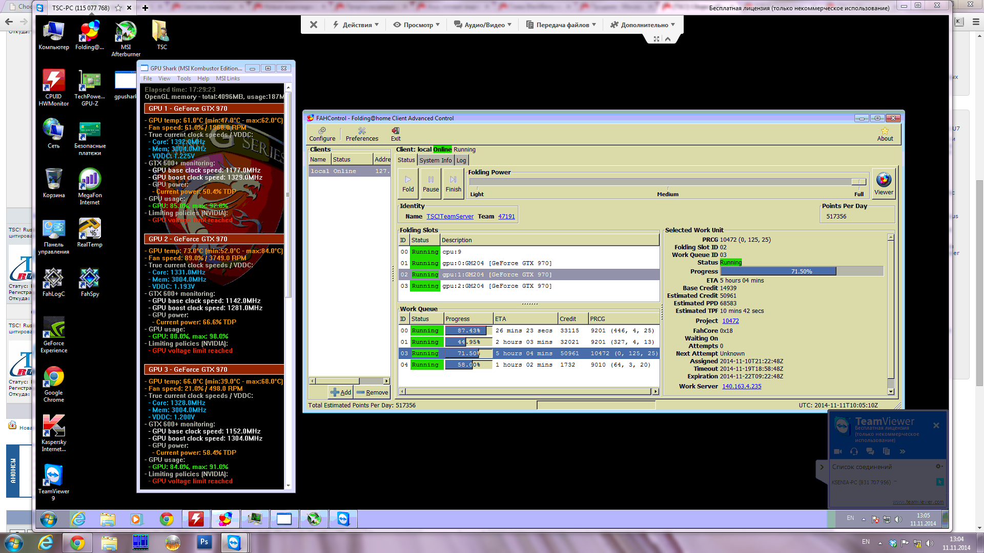 sco01 это не поможет, он обязательно начнёт что-то проверять, грузя проц, а винда тебе так потоки раскидает, что каспер будет пахать на одном ядре с FahCore_17 и "досвиданья" PPD, привет политике Round-robin . Проверено. На 9201 буксует ? На данный момент это самые наваристые задания для 900й серии. На скриншоте выше задание 10472 Вот на них как раз таки не густо. Вообще я по PPD тут судил, 200к на первой карте это маловато как-то для GTX 970 на частоте 1392, должно быть около 250к, при том что частота на ней выше, чем на на 3й карте, (по второй все понятно, греется до 80 гр и скидывает буст). Советую помониторить загрузку карт на предмет скачков. Если ничего не мешает должна быть почти прямая линия, а не аля кардиограмма.