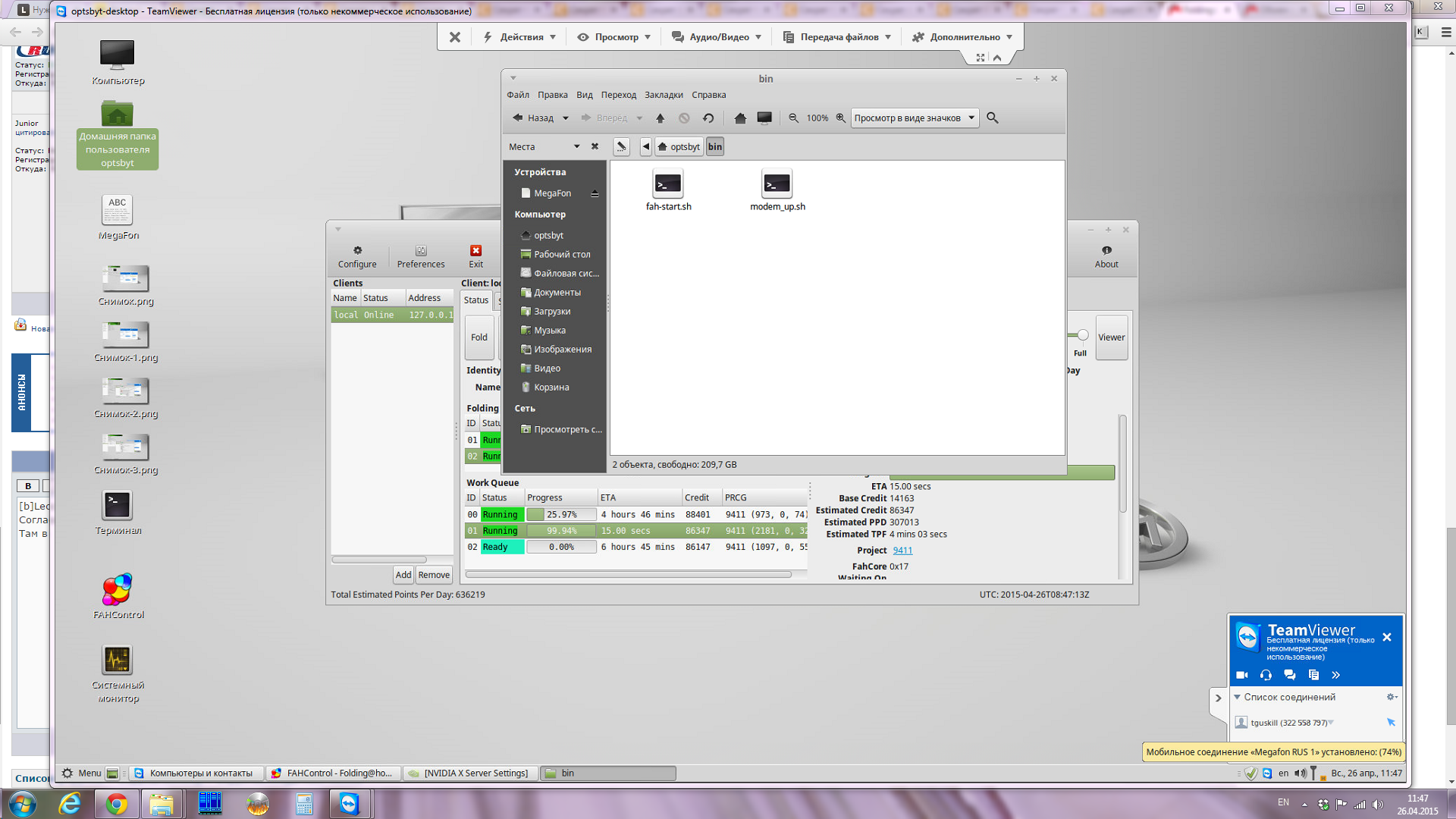 Я правильно понимаю, что x11vnc подключается именно к локальной графической сессии? В смысле, подключение через x11vnc равнозначно локальному логину? Это всё к вопросу правильного запуска фолдинга. Пробую ща x2go - в процессах нихрена не дочка графического сервера. Попытка запустить амд каталист при подключении через x2go приводит к ругани "нет графической карты". Наверное, именно в этом дело. Не видит оно карту. Видимо, запилили изоляцию дерев процессов. Логин-то один и тот же, прав, по-идее, должно хватать. Значит, удалённо подключаться надо так, как будто ты работаешь локально. То есть, попасть в ветку процессов, родителем которой является графический сервер, работающий с настоящим железом машины. Судя по описанию x11vnc, это то, что надо. Пробую. По результату отпишусь.